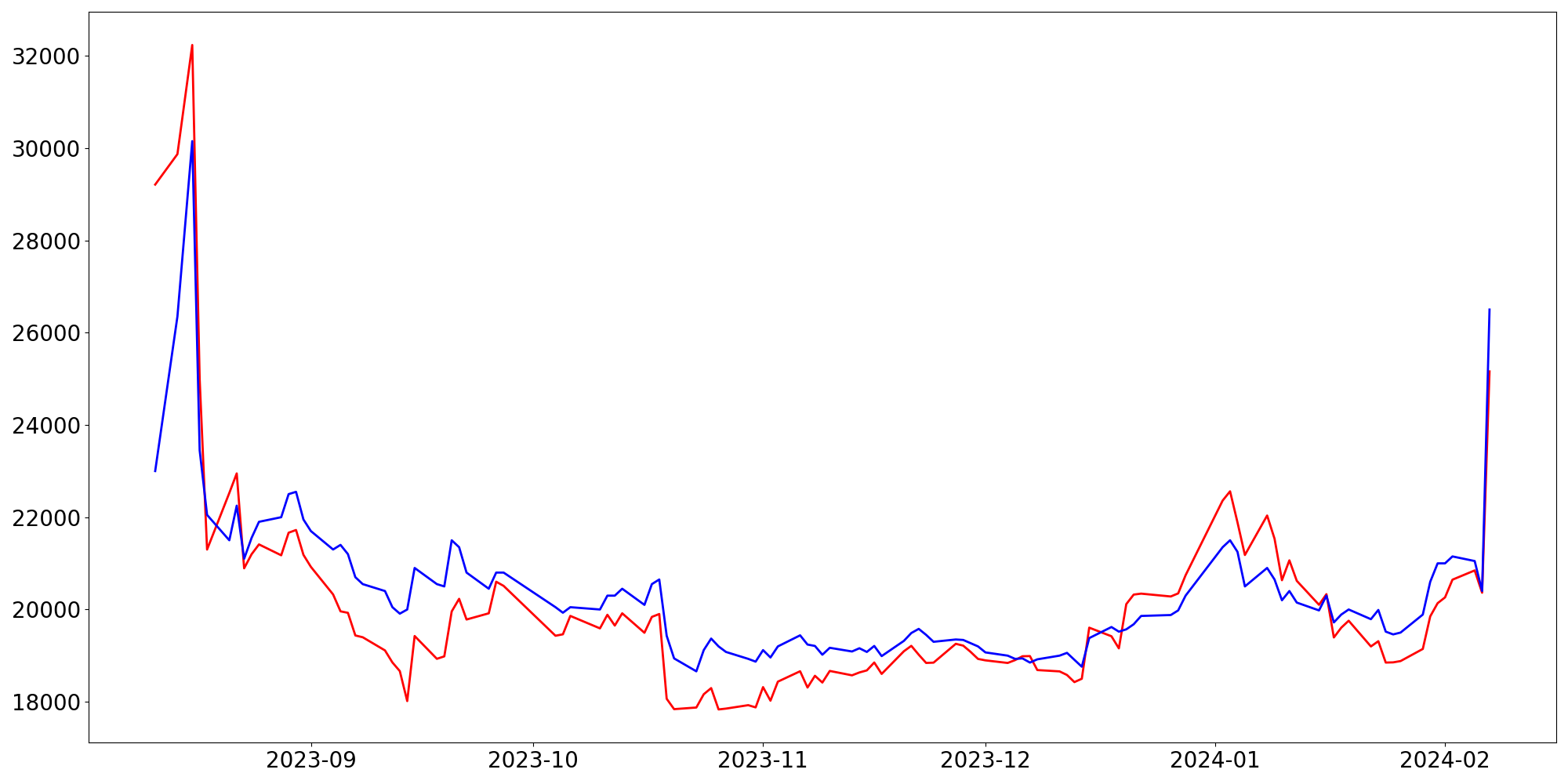 [ - : 실제값(종가) / - : 예측값(종가) ]
