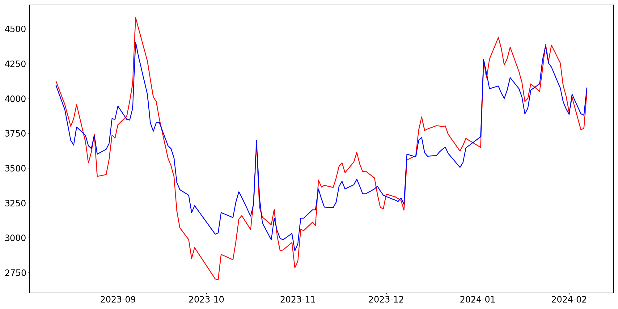 [ - : 실제값(종가) / - : 예측값(종가) ]