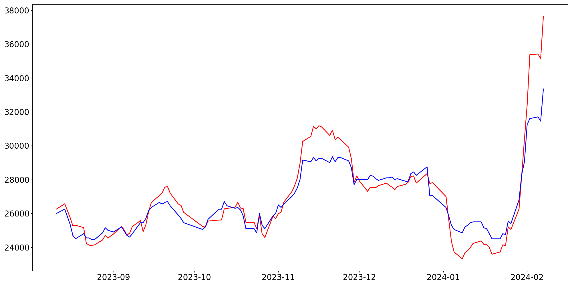 [ - : 실제값(종가) / - : 예측값(종가) ]