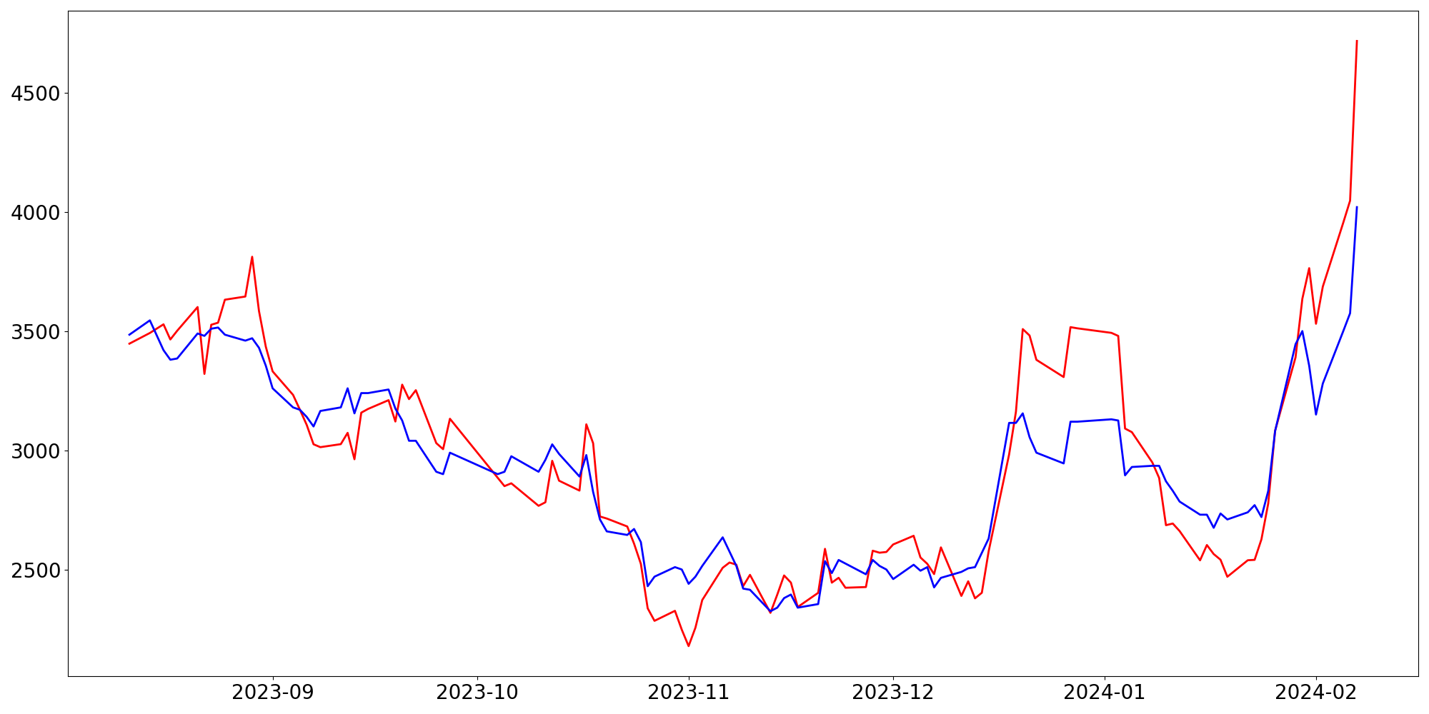 [ - : 실제값(종가) / - : 예측값(종가) ]