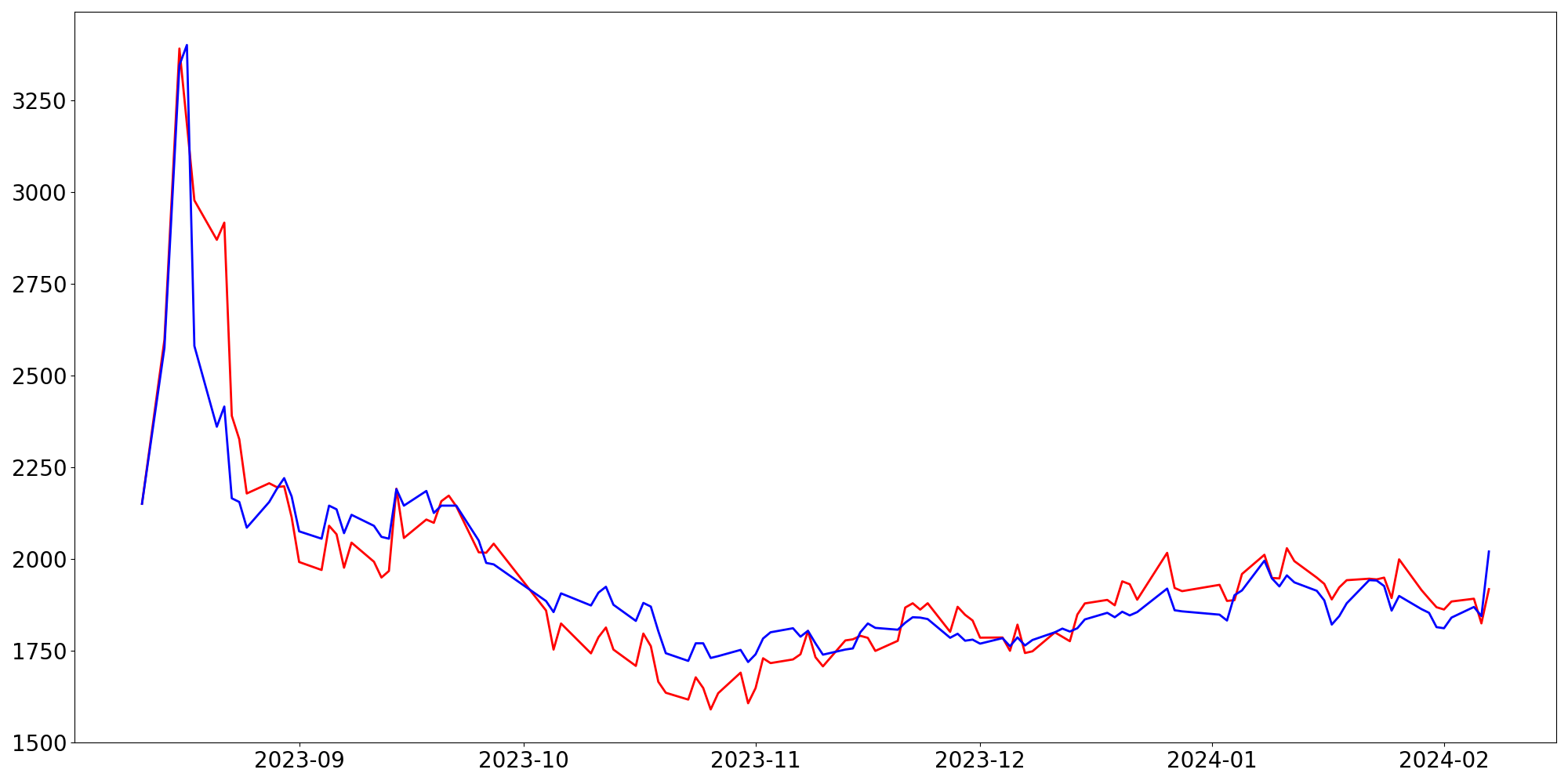 [ - : 실제값(종가) / - : 예측값(종가) ]