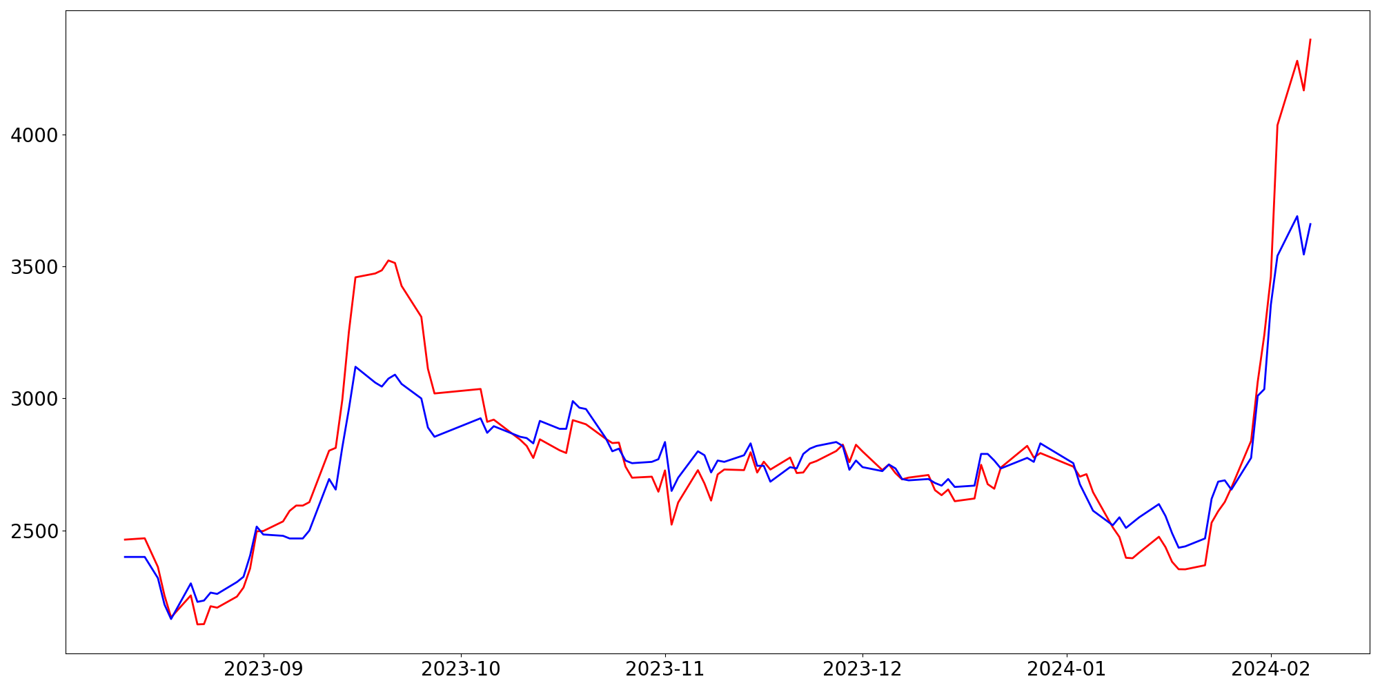 [ - : 실제값(종가) / - : 예측값(종가) ]