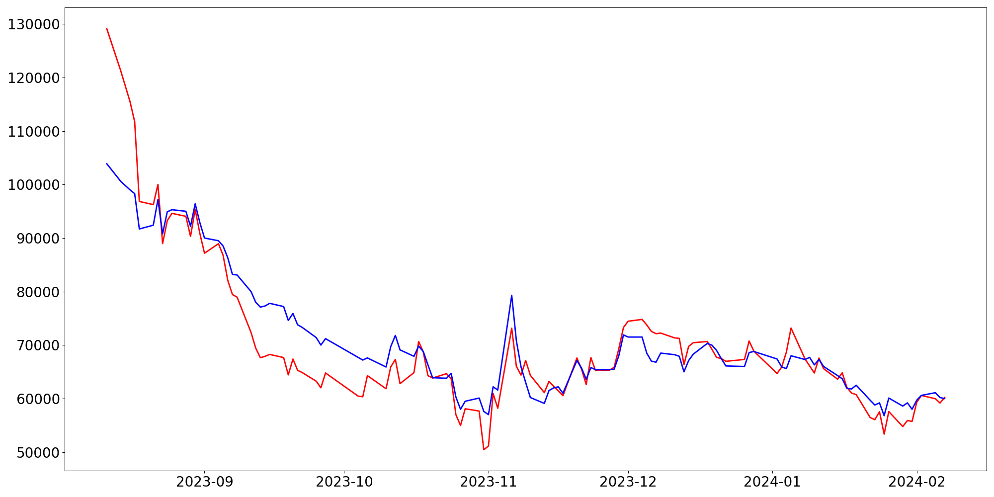 [ - : 실제값(종가) / - : 예측값(종가) ]