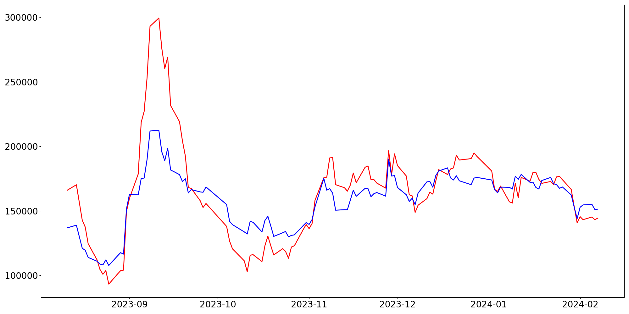 [ - : 실제값(종가) / - : 예측값(종가) ]