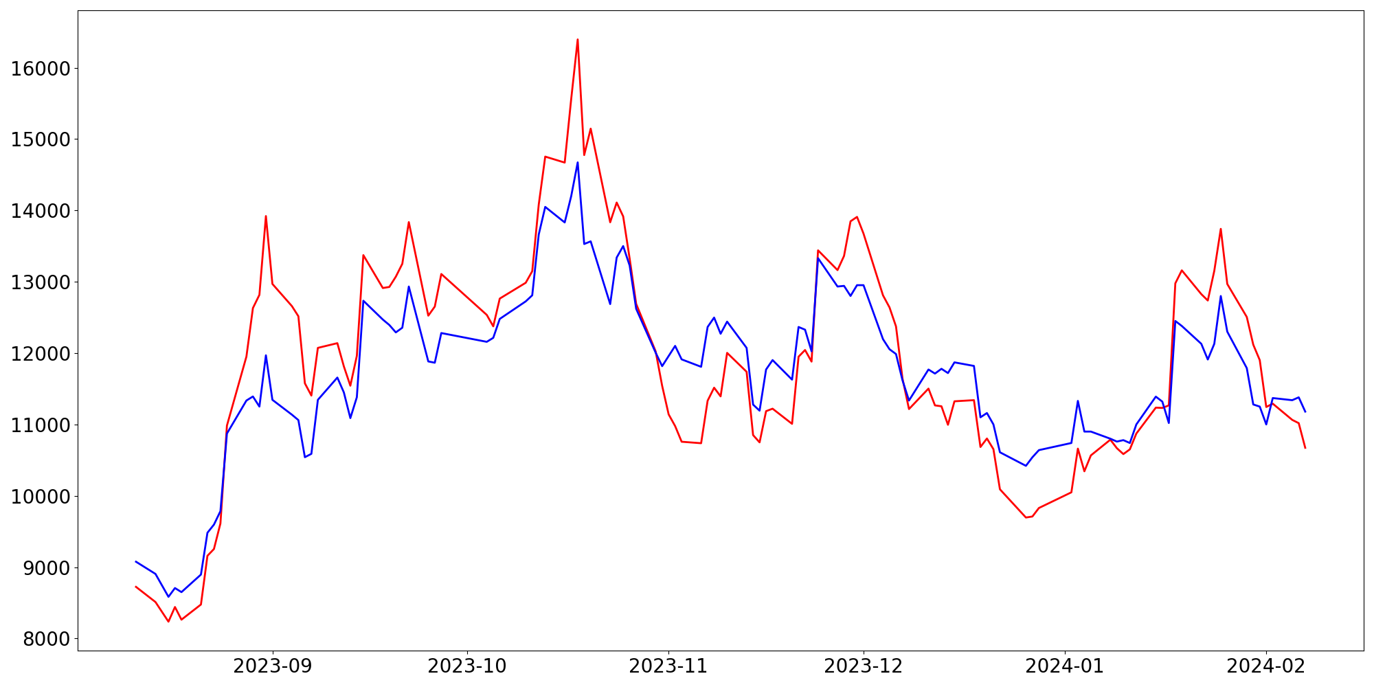 [ - : 실제값(종가) / - : 예측값(종가) ]