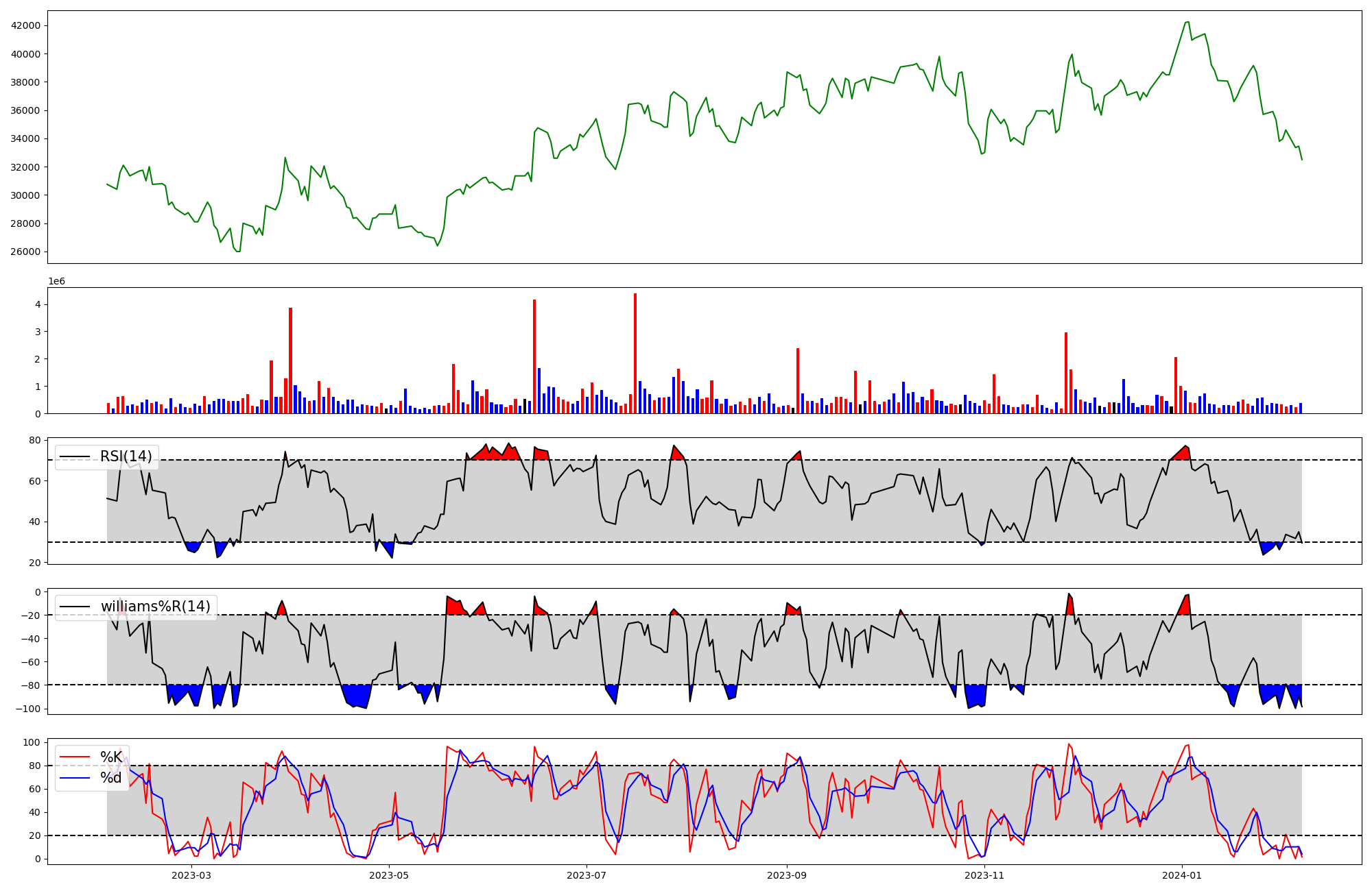 □ 장기 : 현재 종가가 장기(250일) 이동평균값(33,923원)을 하회 하여 장기적 추세 하락 중