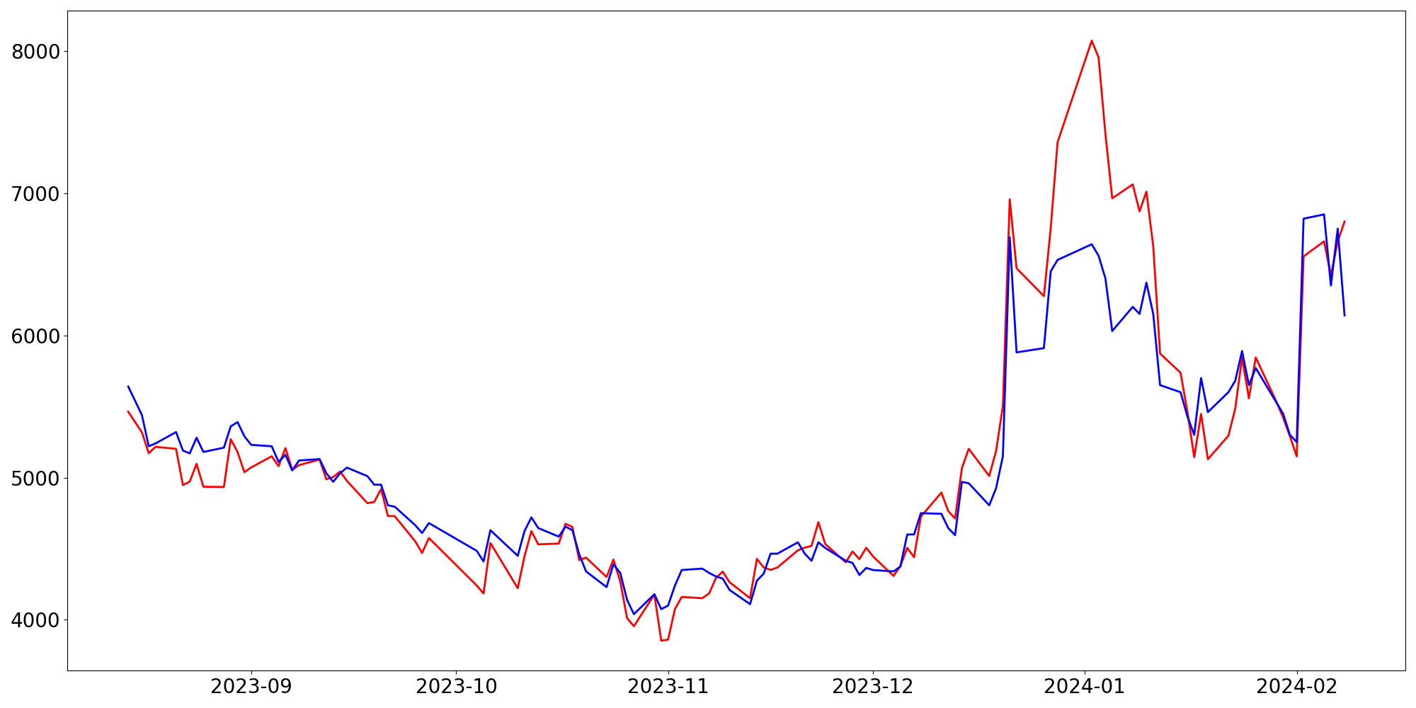 [ - : 실제값(종가) / - : 예측값(종가) ]