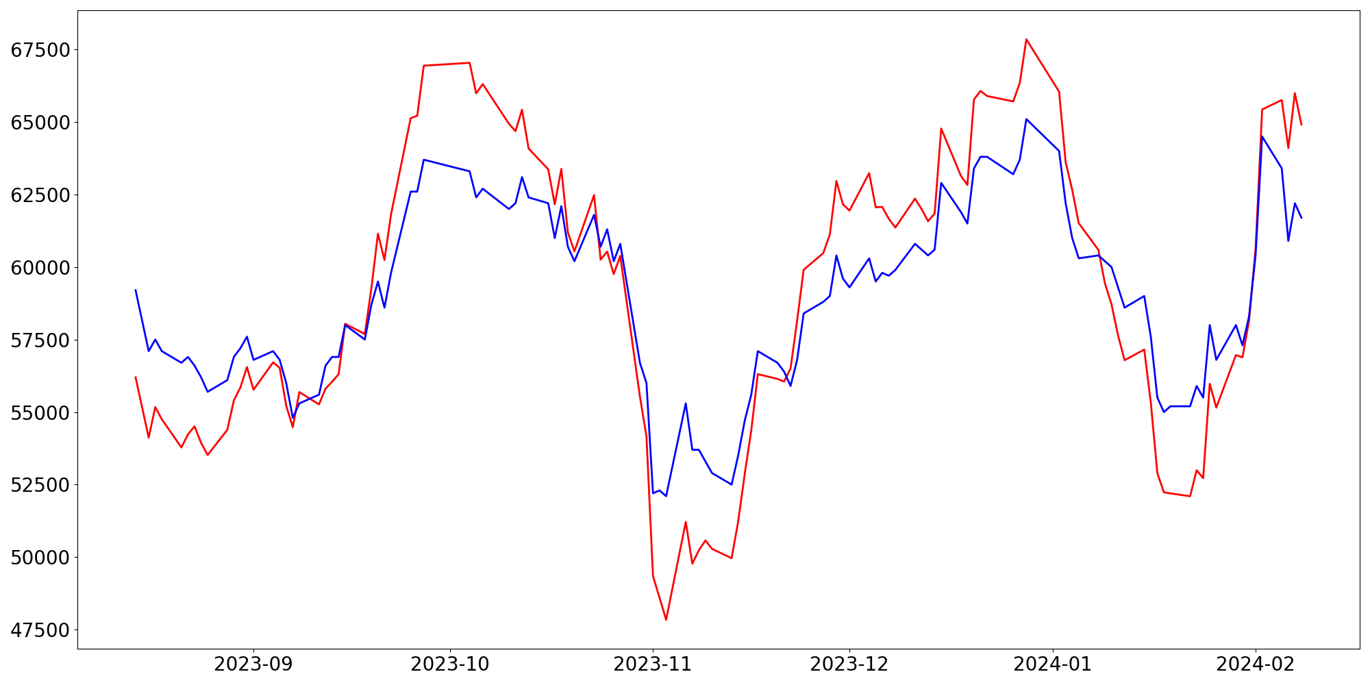 [ - : 실제값(종가) / - : 예측값(종가) ]