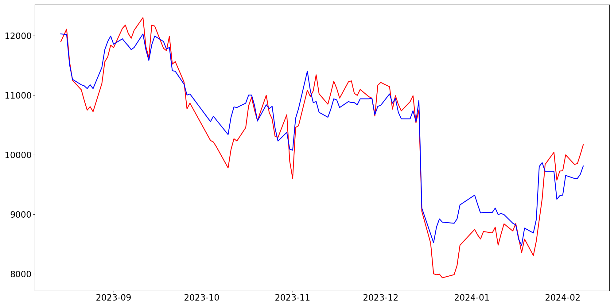 [ - : 실제값(종가) / - : 예측값(종가) ]