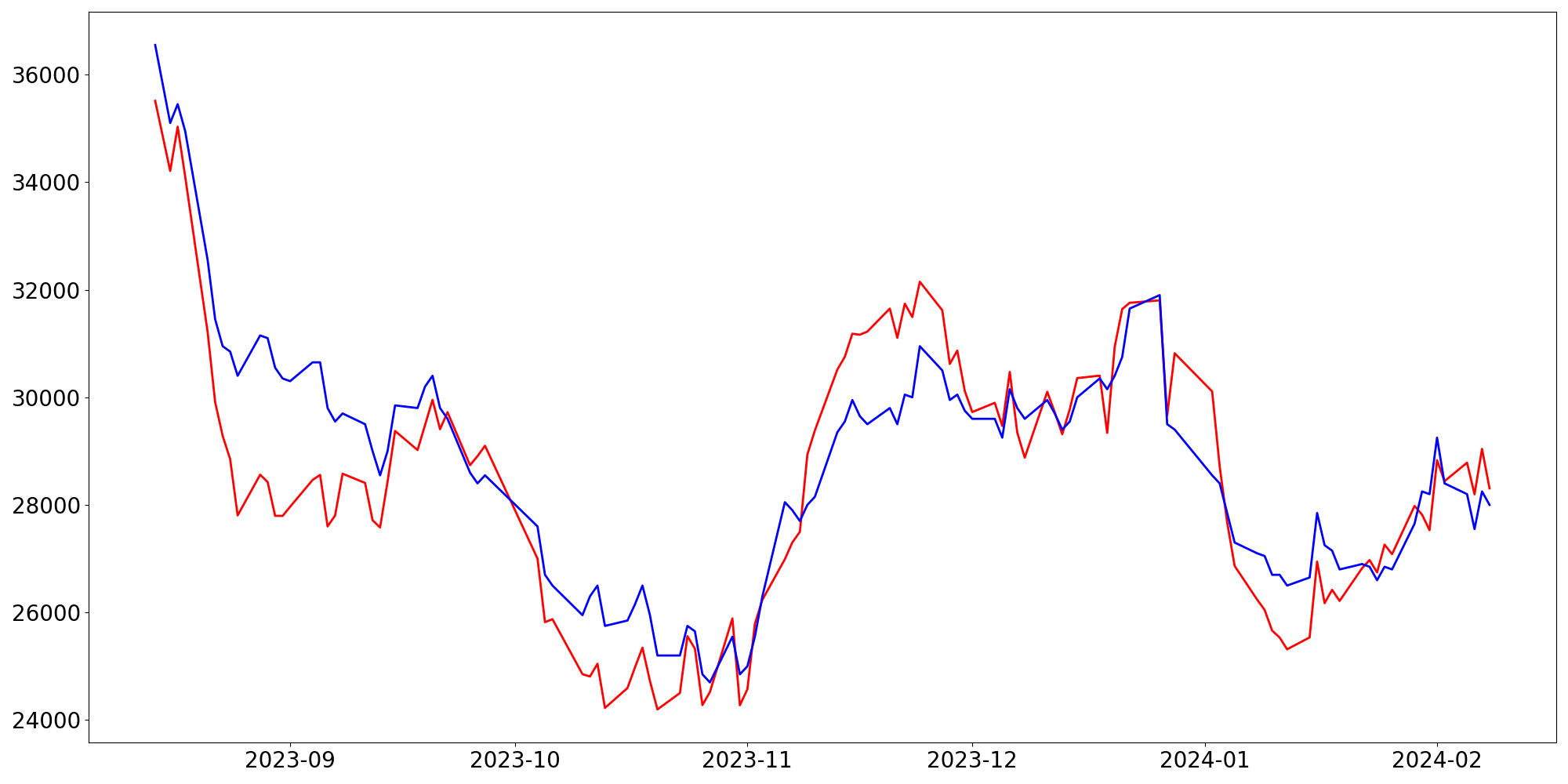 [ - : 실제값(종가) / - : 예측값(종가) ]