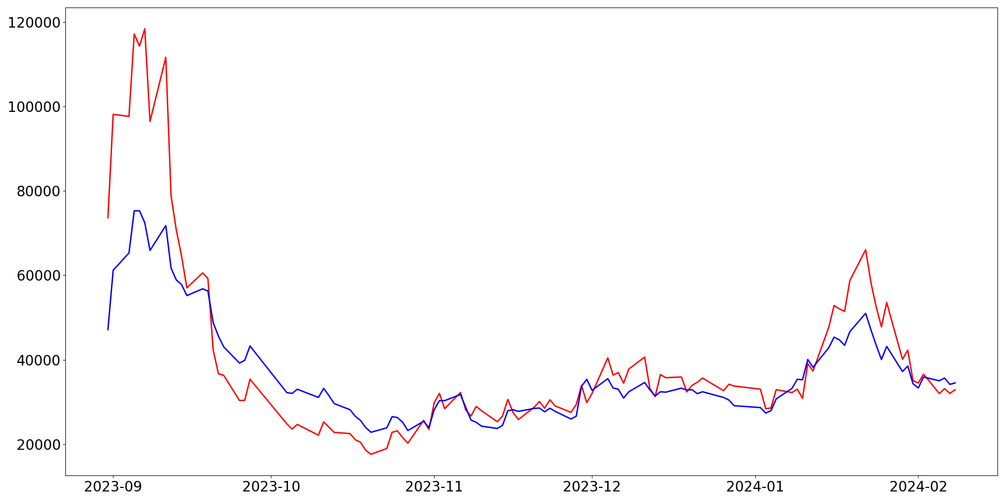 [ - : 실제값(종가) / - : 예측값(종가) ]
