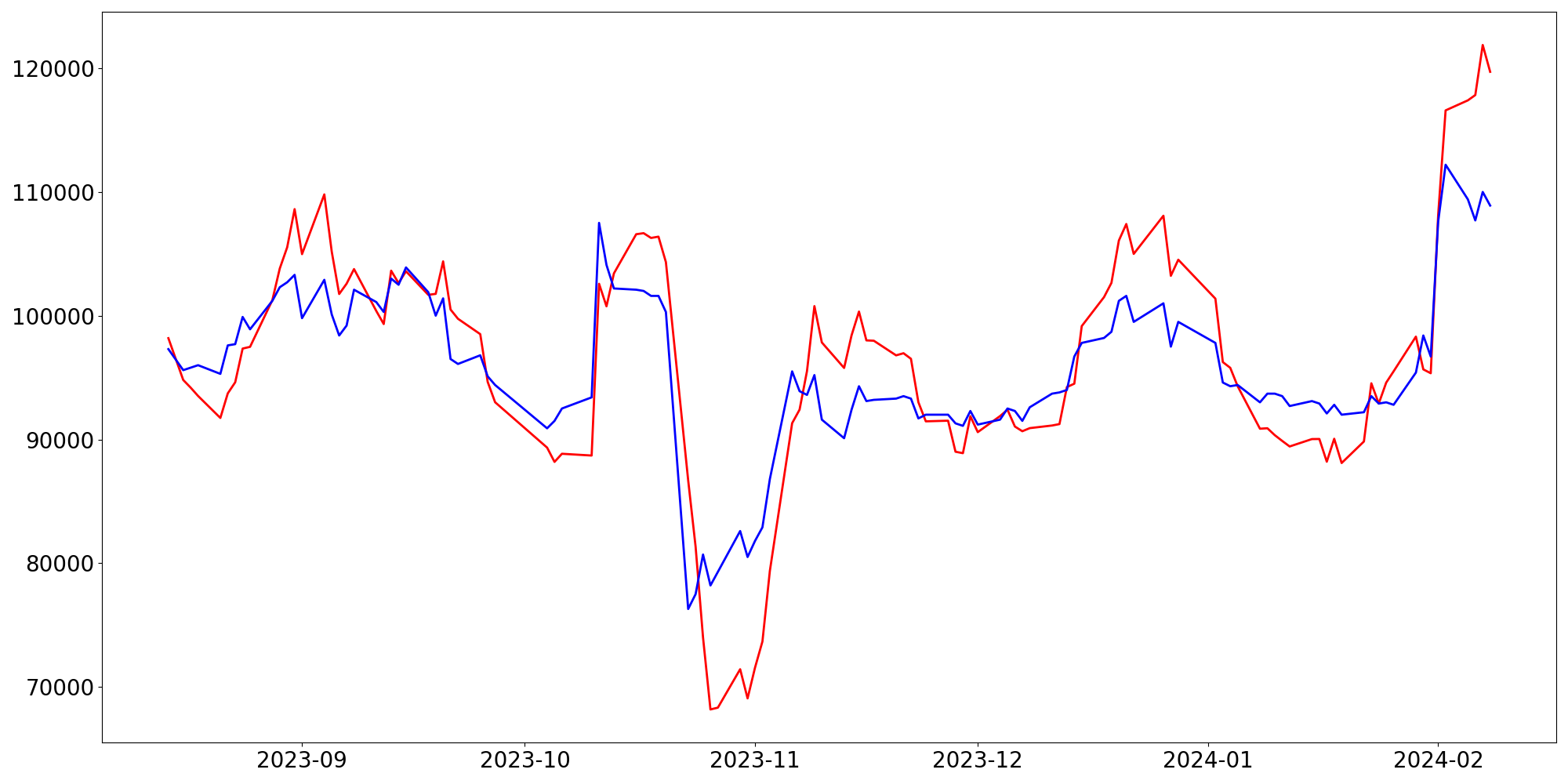[ - : 실제값(종가) / - : 예측값(종가) ]