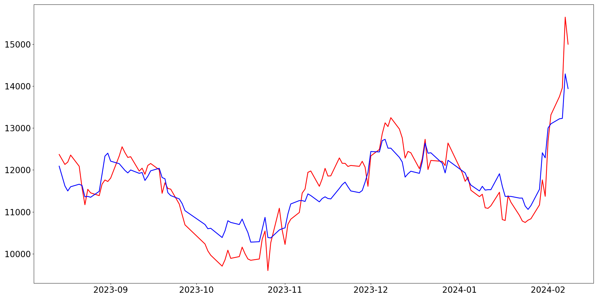 [ - : 실제값(종가) / - : 예측값(종가) ]