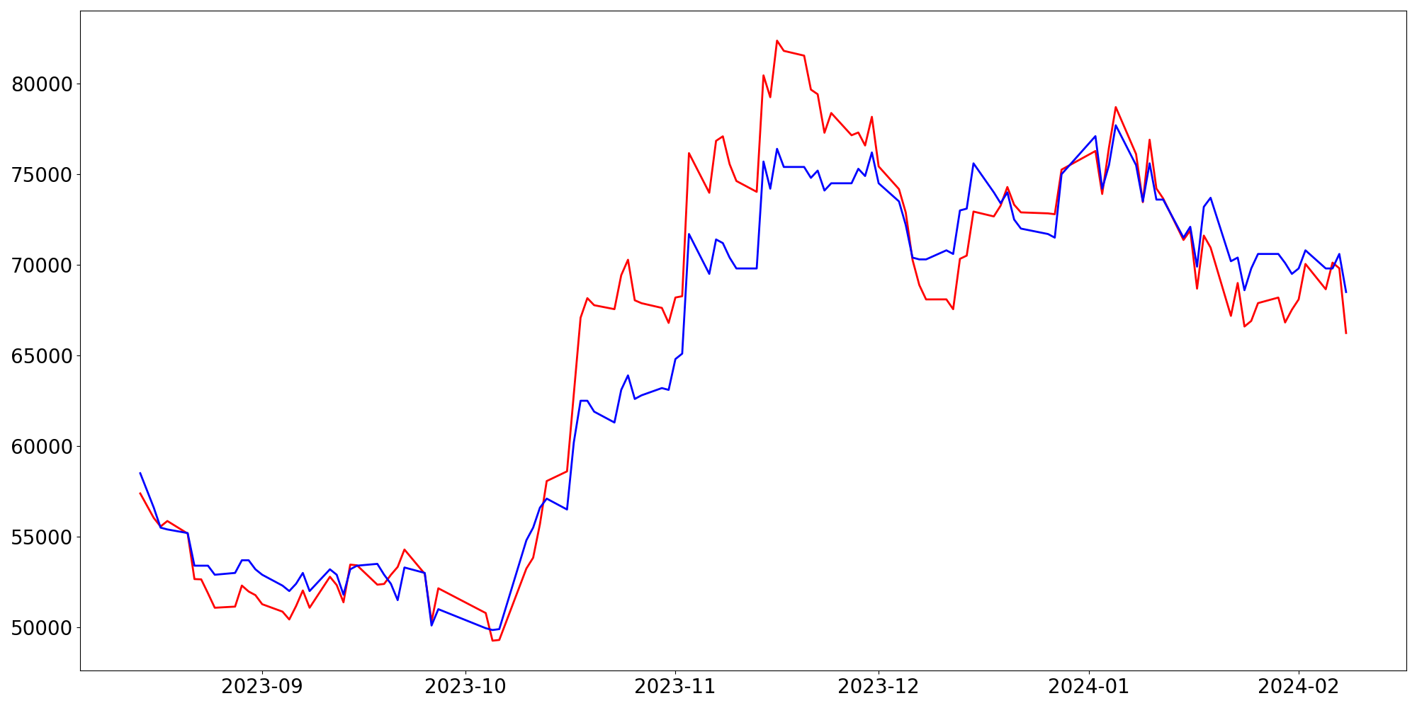 [ - : 실제값(종가) / - : 예측값(종가) ]