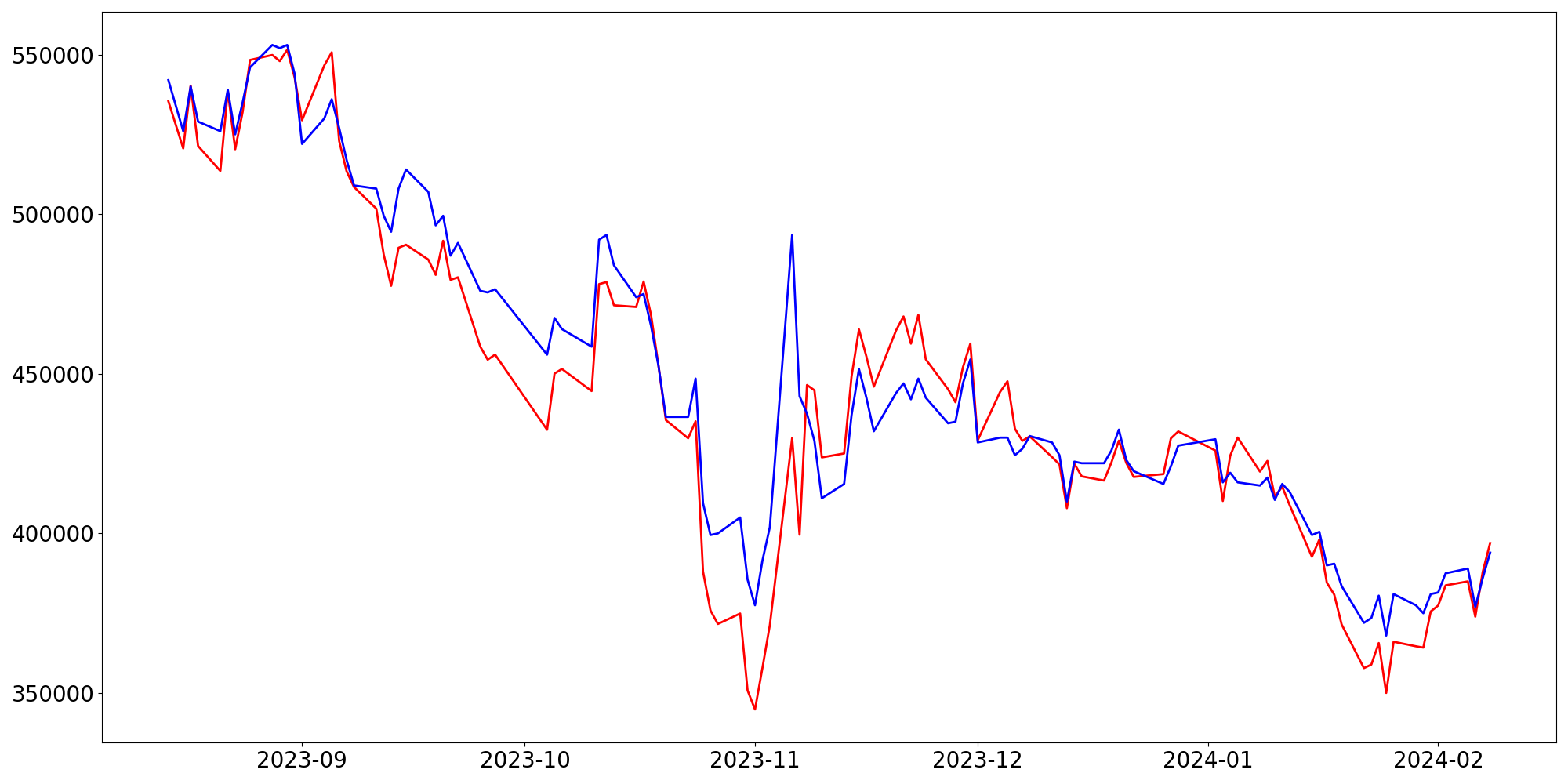 [ - : 실제값(종가) / - : 예측값(종가) ]