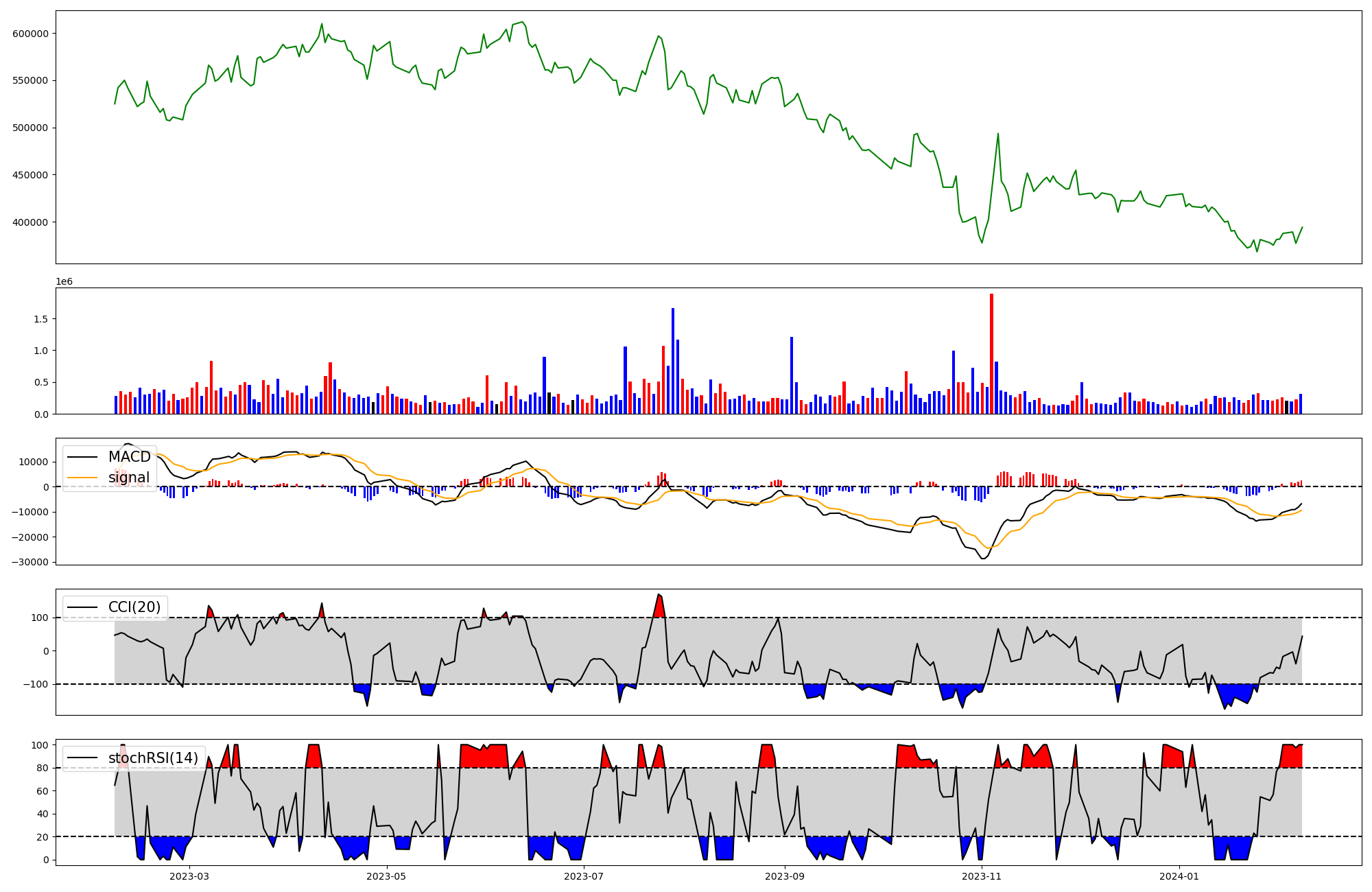 □ 중기 : 현재 종가가 중기(60일) 이동평균값(414,367원)을 하회 하여 중기적 추세 하락 중