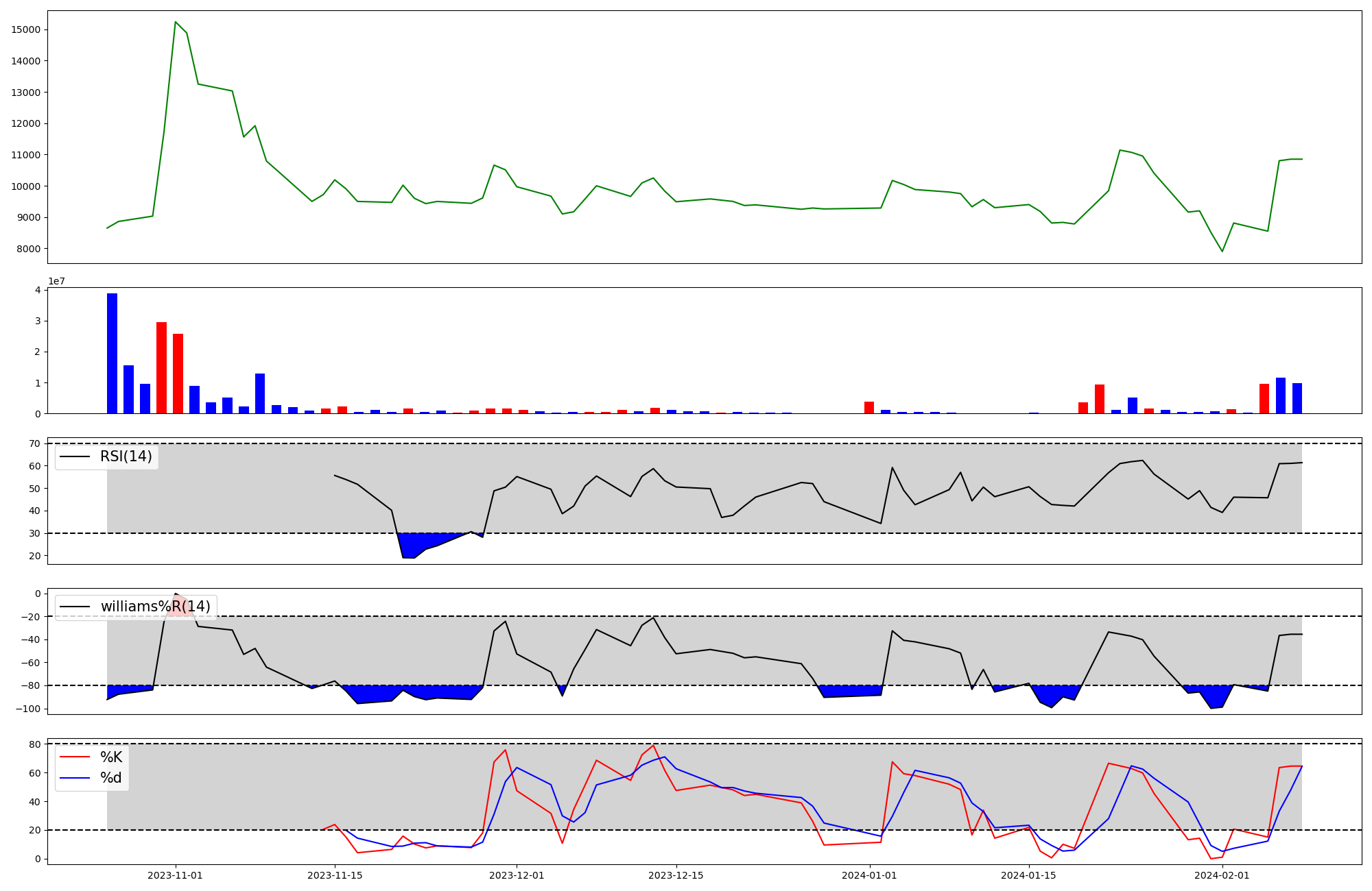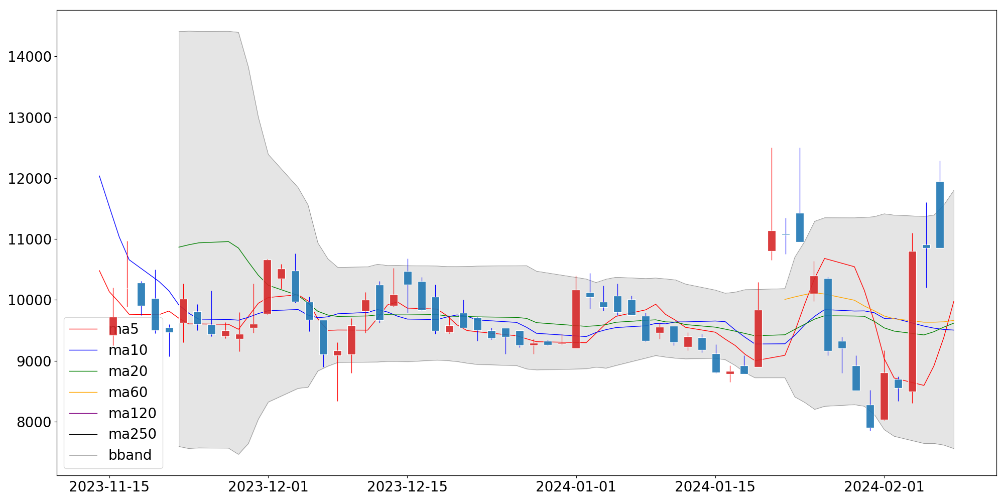 □ 장기 : 현재 종가가 장기(250일) 이동평균값(nan원)을 상회 하여 장기적 추세 상승 중