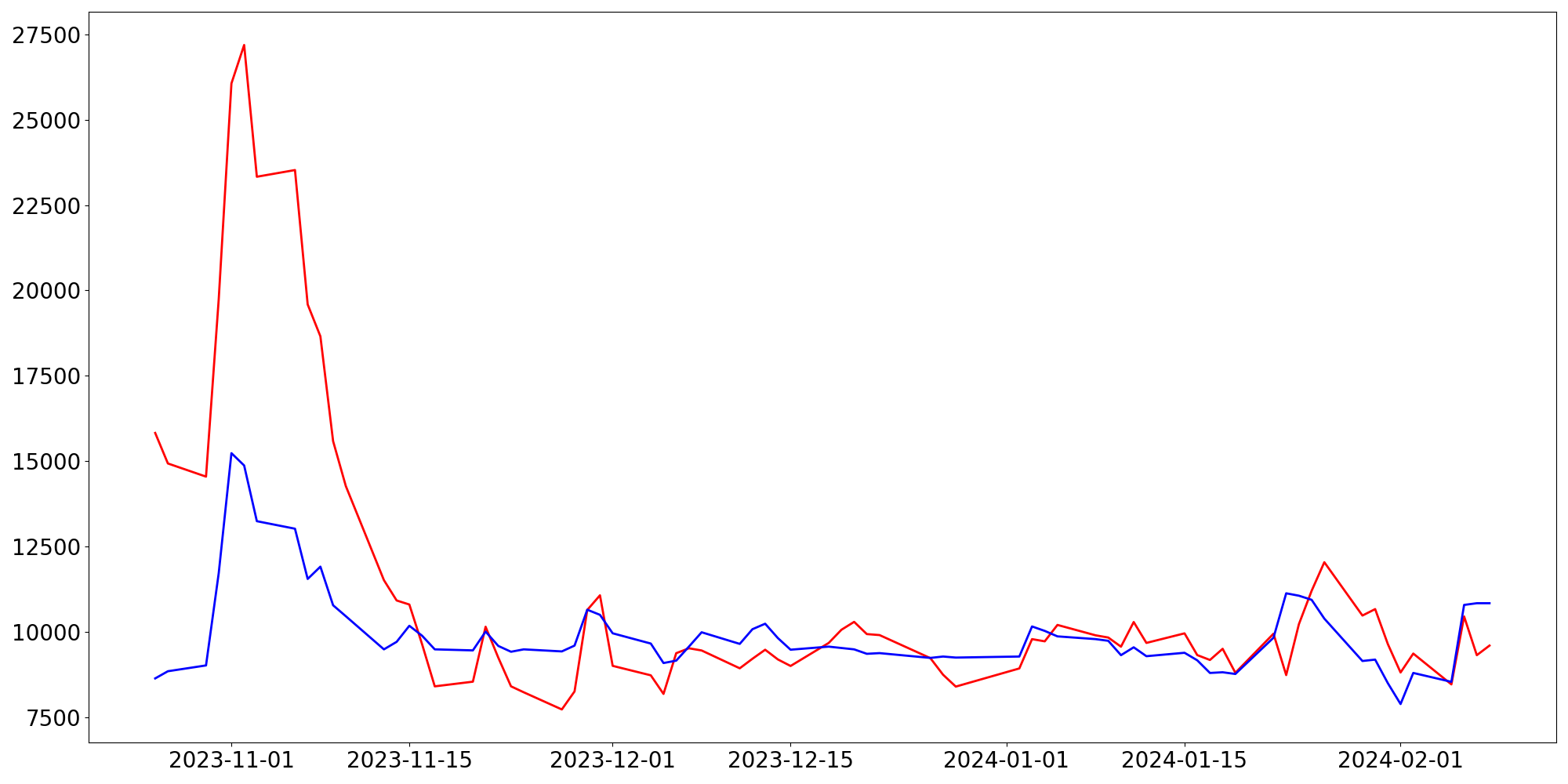 [ - : 실제값(종가) / - : 예측값(종가) ]