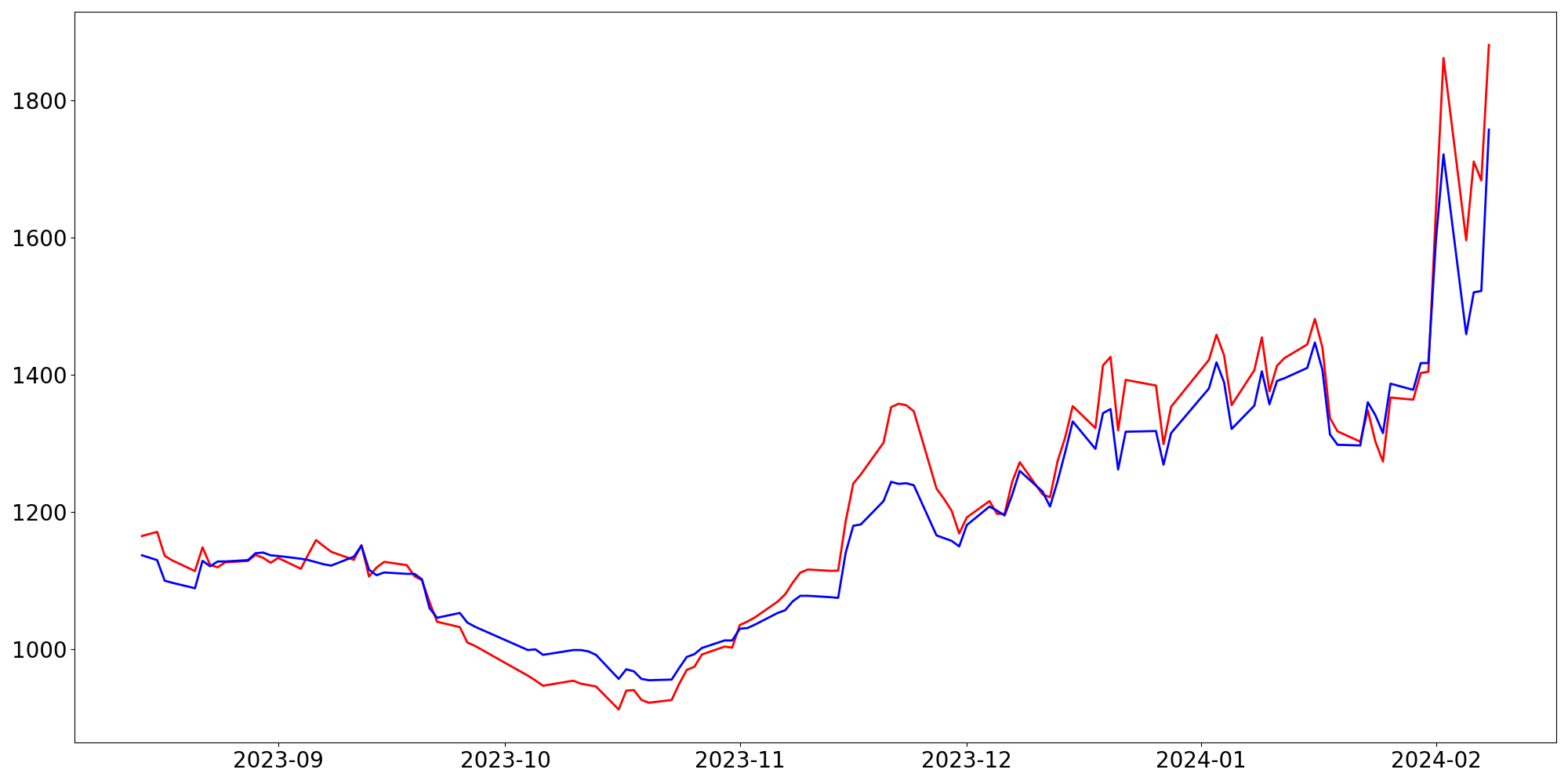 [ - : 실제값(종가) / - : 예측값(종가) ]