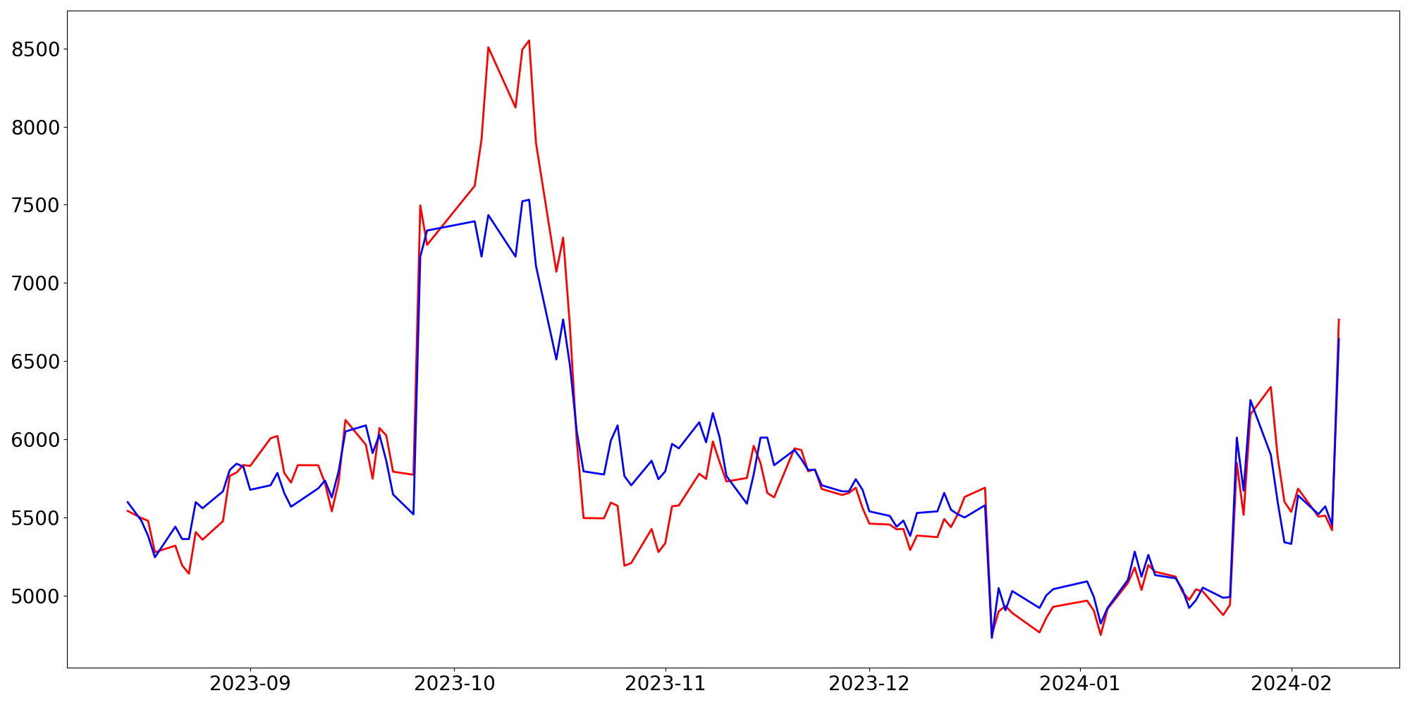 [ - : 실제값(종가) / - : 예측값(종가) ]