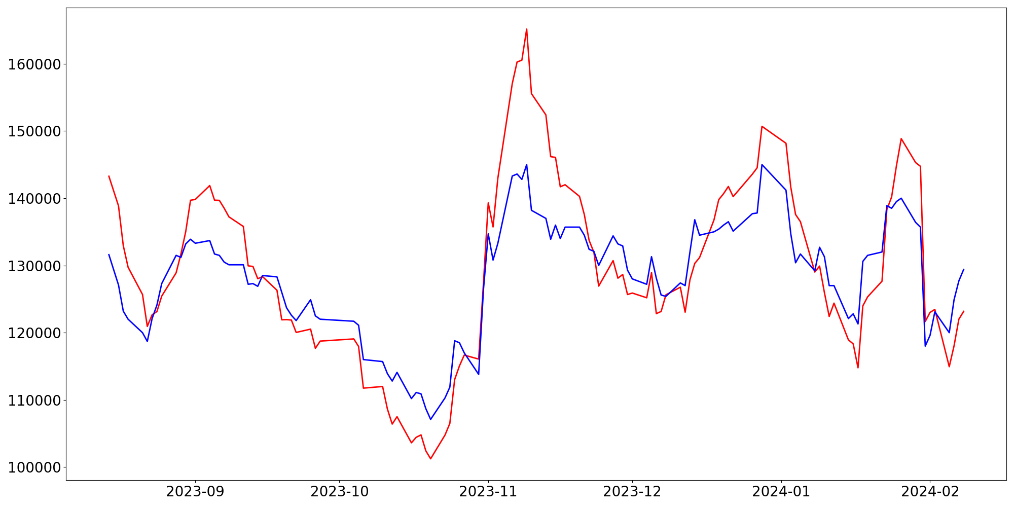 [ - : 실제값(종가) / - : 예측값(종가) ]