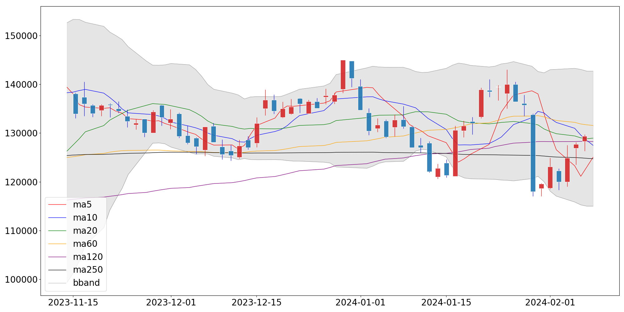 □ 중기 : 현재 종가가 중기(60일) 이동평균값(131,552원)을 하회 하여 중기적 추세 하락 중