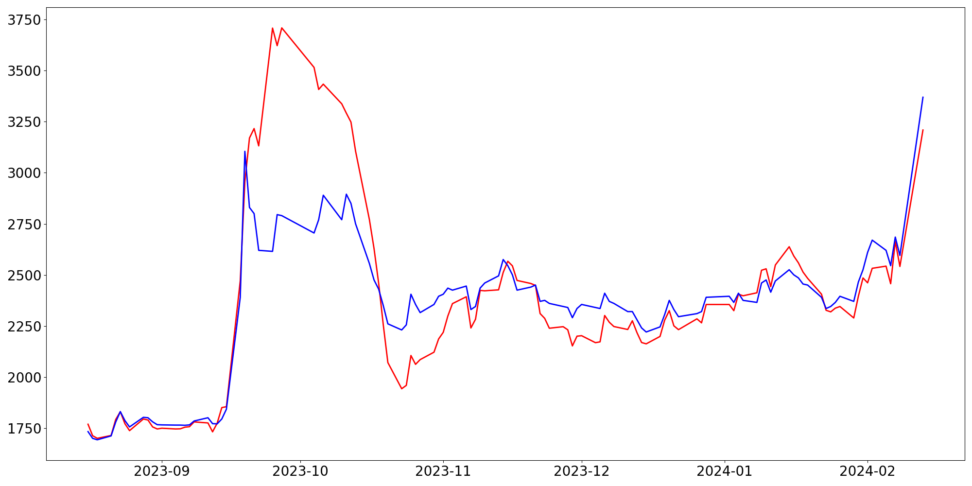 [ - : 실제값(종가) / - : 예측값(종가) ]
