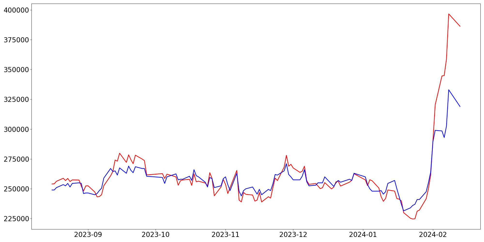 [ - : 실제값(종가) / - : 예측값(종가) ]