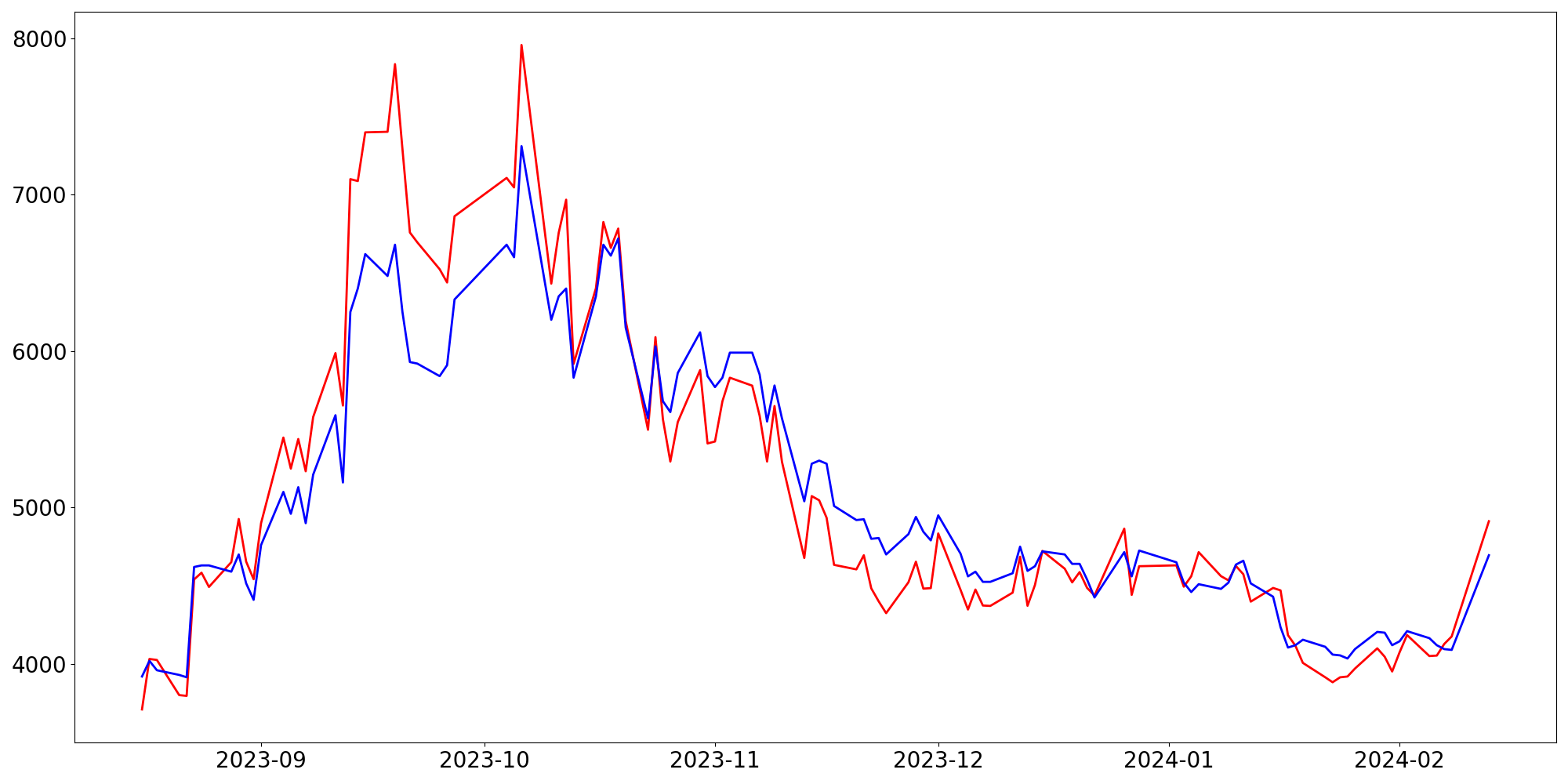 [ - : 실제값(종가) / - : 예측값(종가) ]