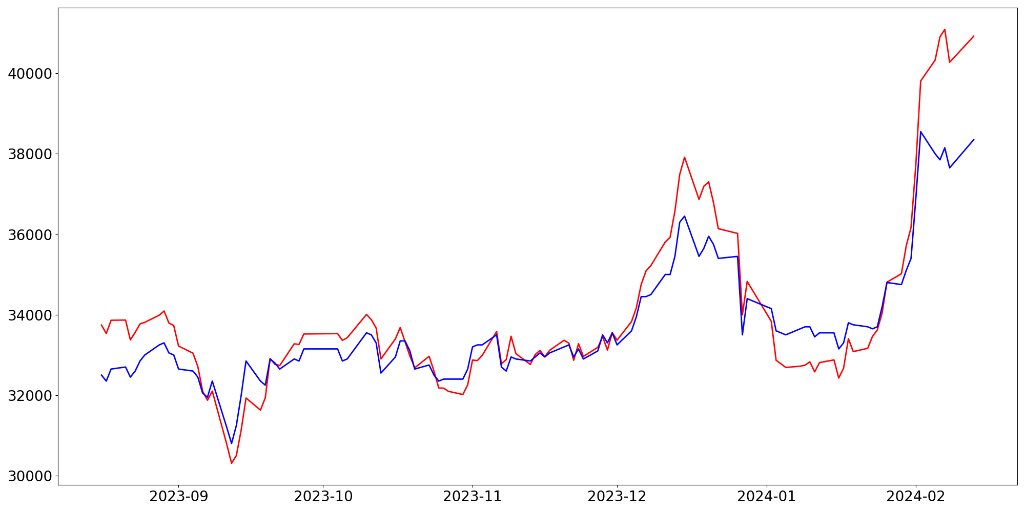 [ - : 실제값(종가) / - : 예측값(종가) ]