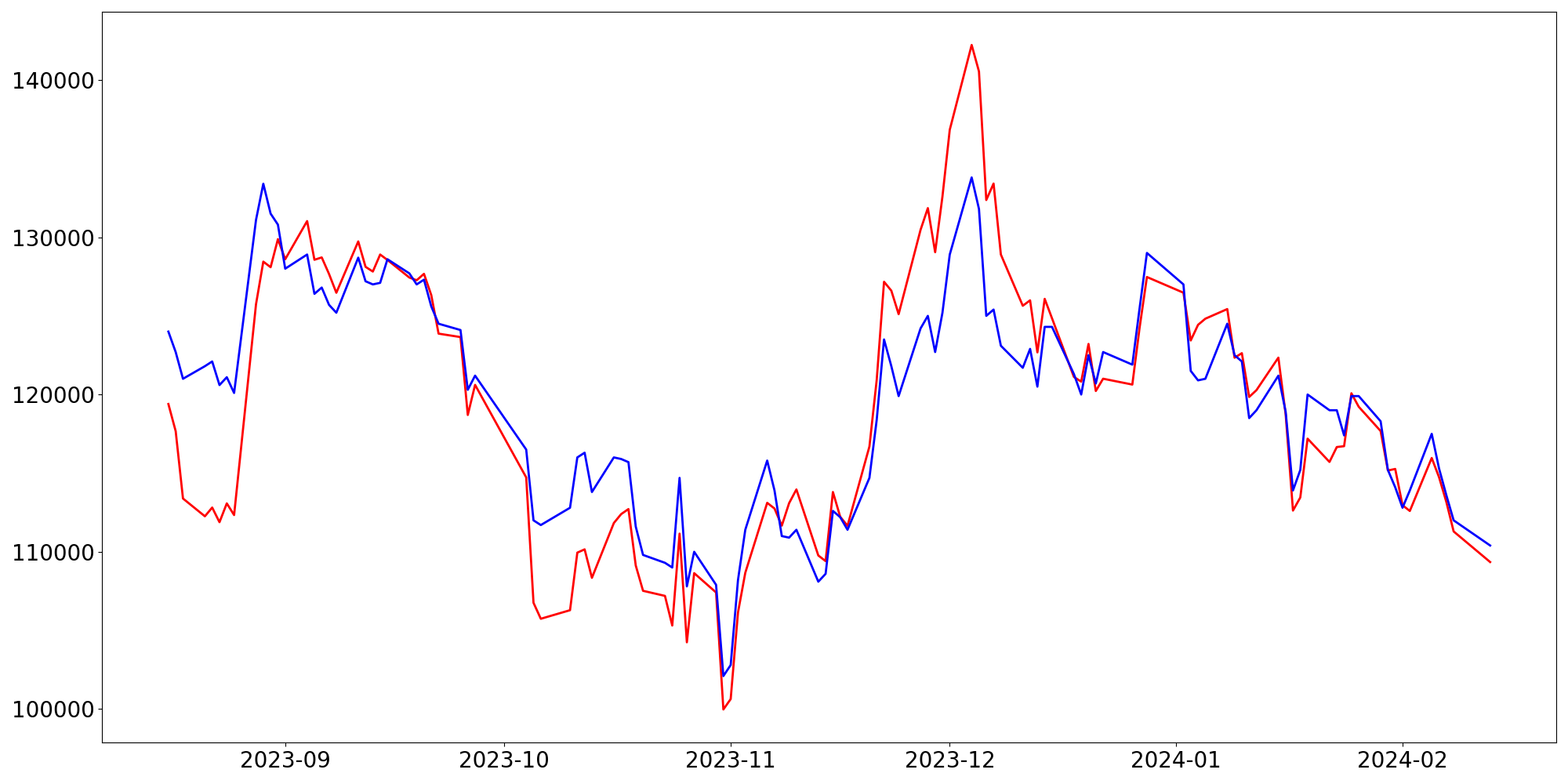 [ - : 실제값(종가) / - : 예측값(종가) ]