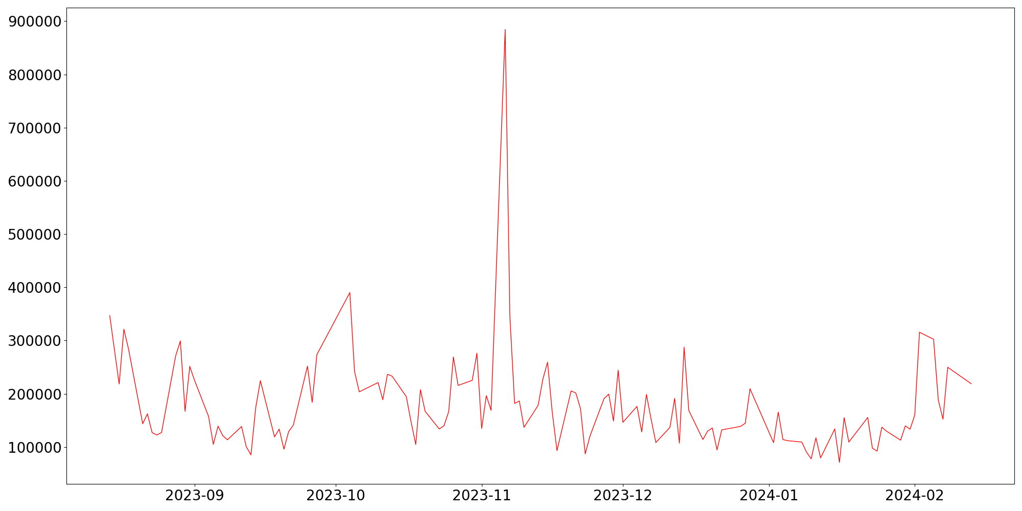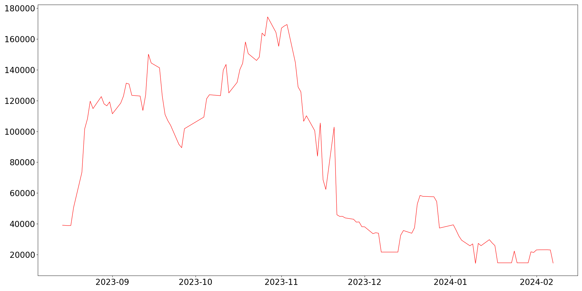 일별 공매도 거래량 추이를 그래프로 나타낸 것으로 공매도 거래량이 증가할 수록 단기적으로 가격 하락을 예측하는 시장참가자가 증거하는 것으로 판단해 볼 수 있습니다.