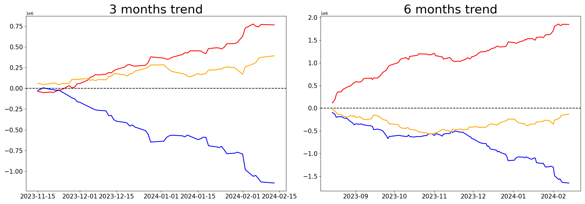 기관, 개인, 외국인으로 분류하여 투자주체별 일정기간동안의 누적적 매수/매도 현황을 분석한 내용입니다. 특정일의 투자자별 매매동향을 통해서 단기간의 시장충격여부를 판단할 수 있으며 장기적인 매매동향을 통해서 해당 종목의 장기 모멘텀을 판단해 볼 수 있습니다.