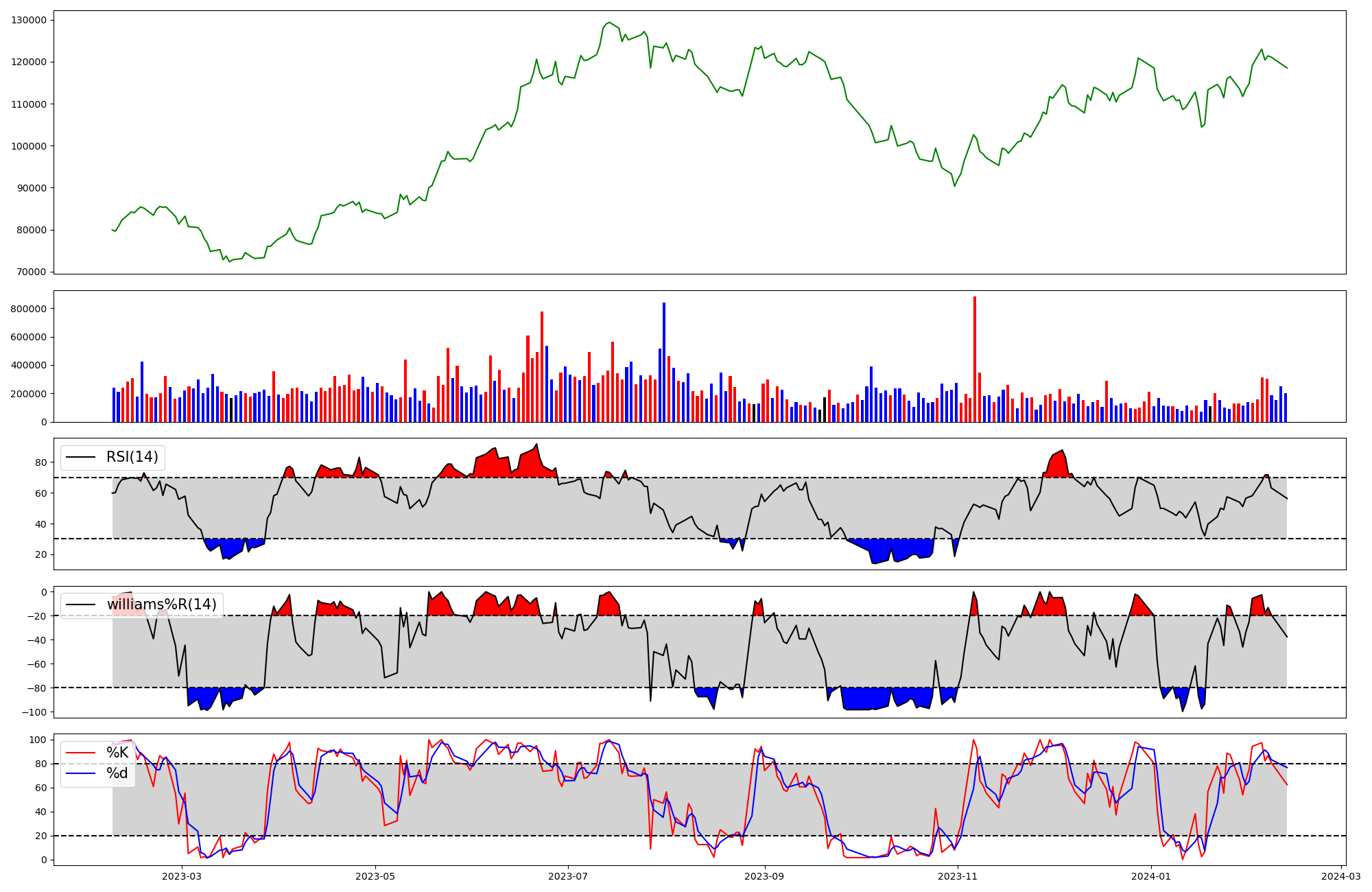 일별 기술적 지표(모멘텀 / 추세 / 시장강도 등)를 활용하여 향후 주가의 움직임을 회귀분석(Regression Analysis)을 통햬 예측해 본 결과입니다.