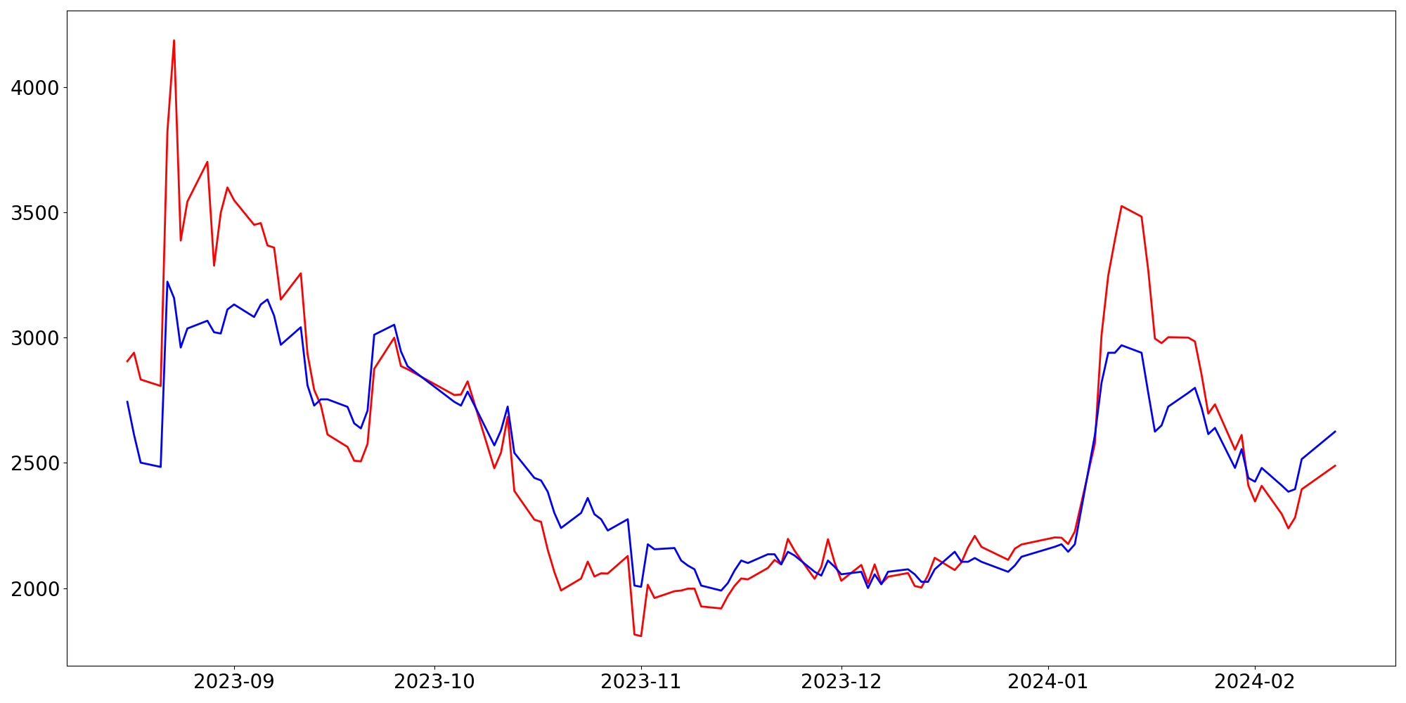 [ - : 실제값(종가) / - : 예측값(종가) ]