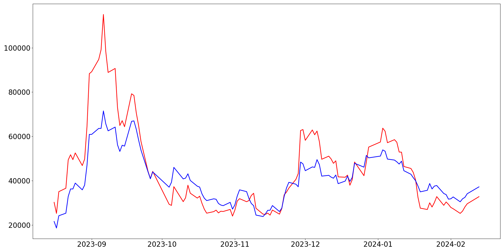 [ - : 실제값(종가) / - : 예측값(종가) ]
