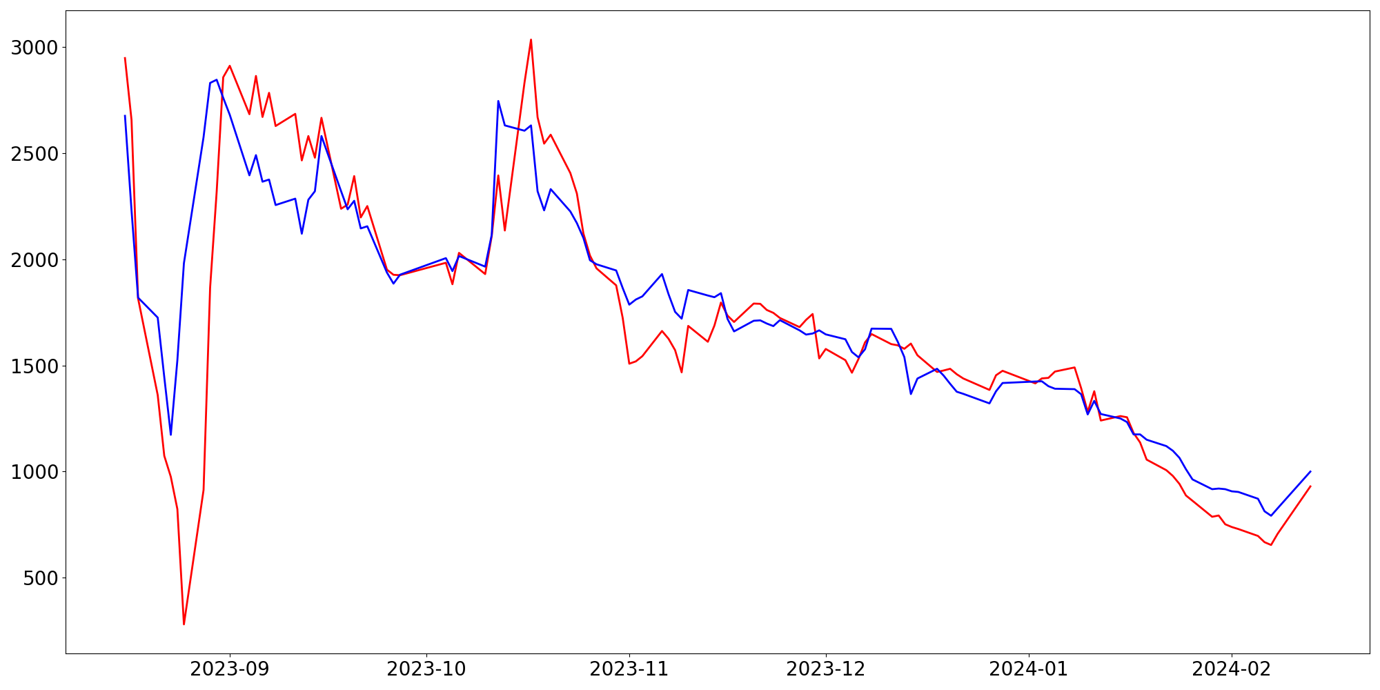 [ - : 실제값(종가) / - : 예측값(종가) ]