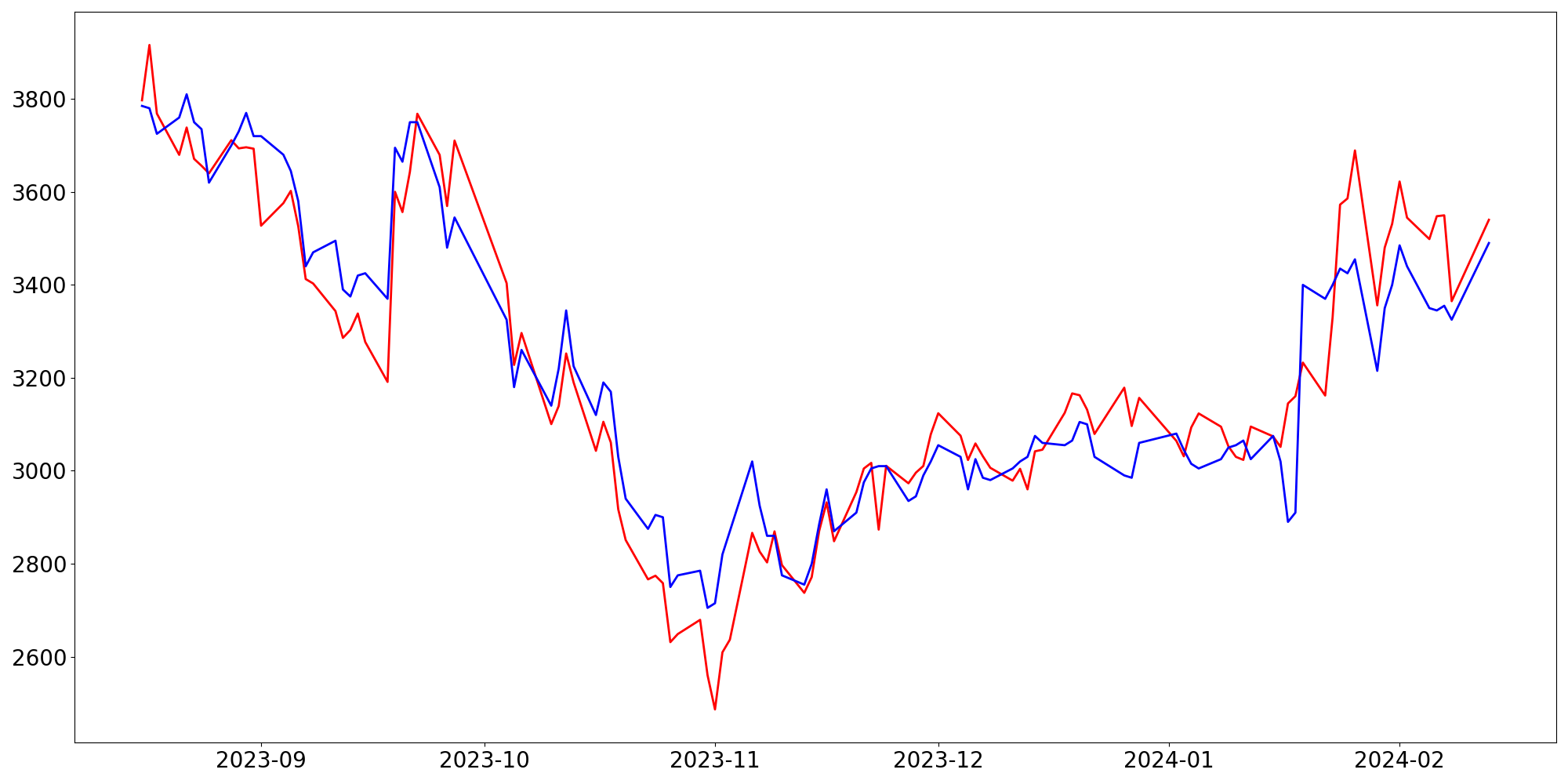 [ - : 실제값(종가) / - : 예측값(종가) ]