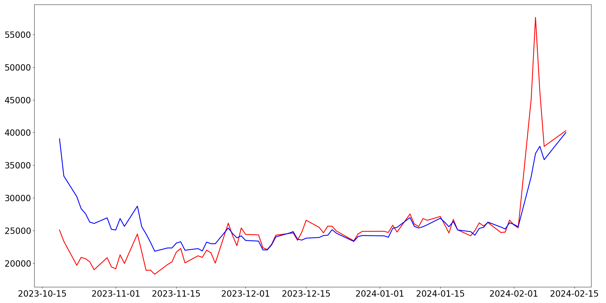 [ - : 실제값(종가) / - : 예측값(종가) ]