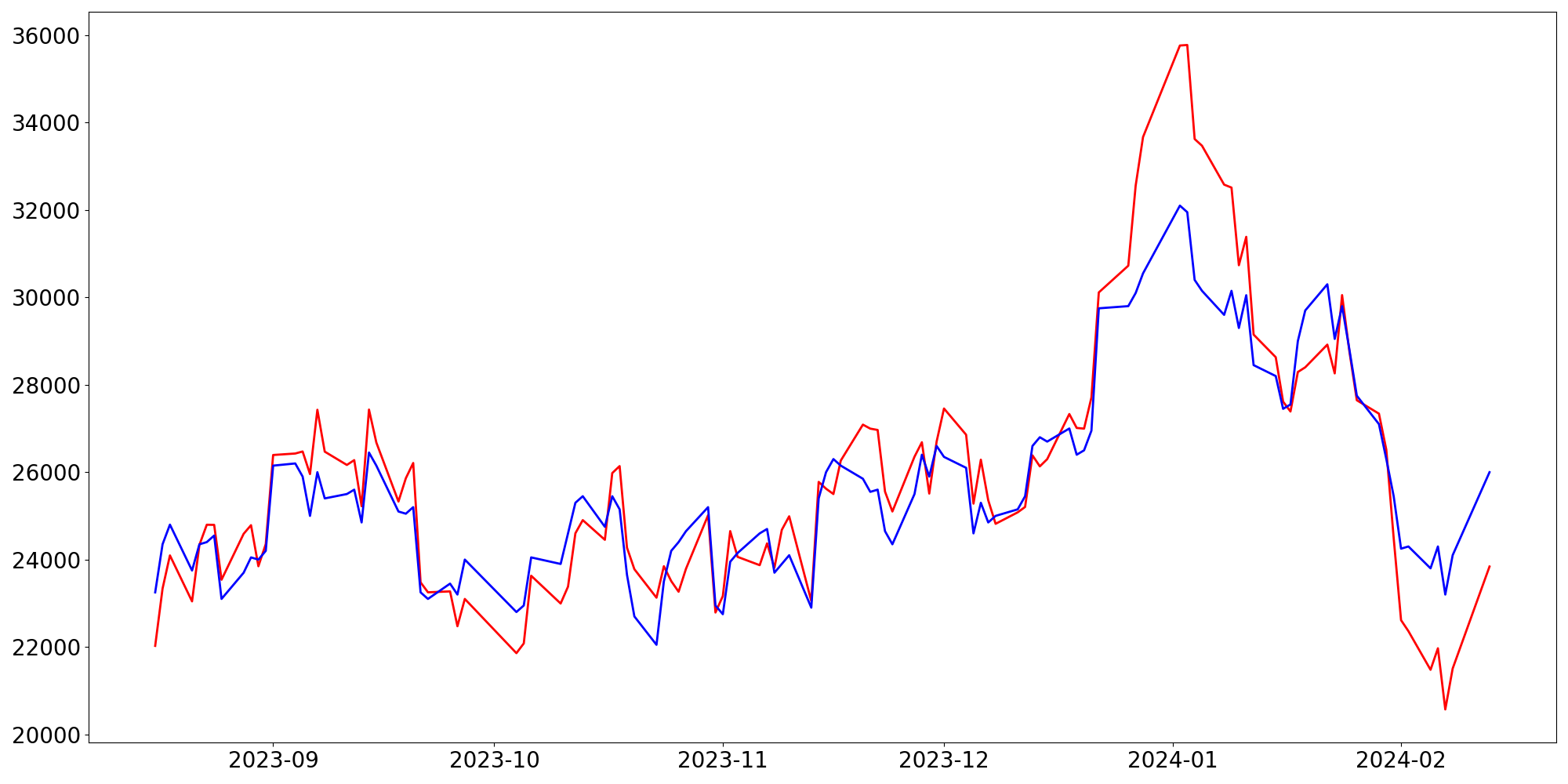 [ - : 실제값(종가) / - : 예측값(종가) ]