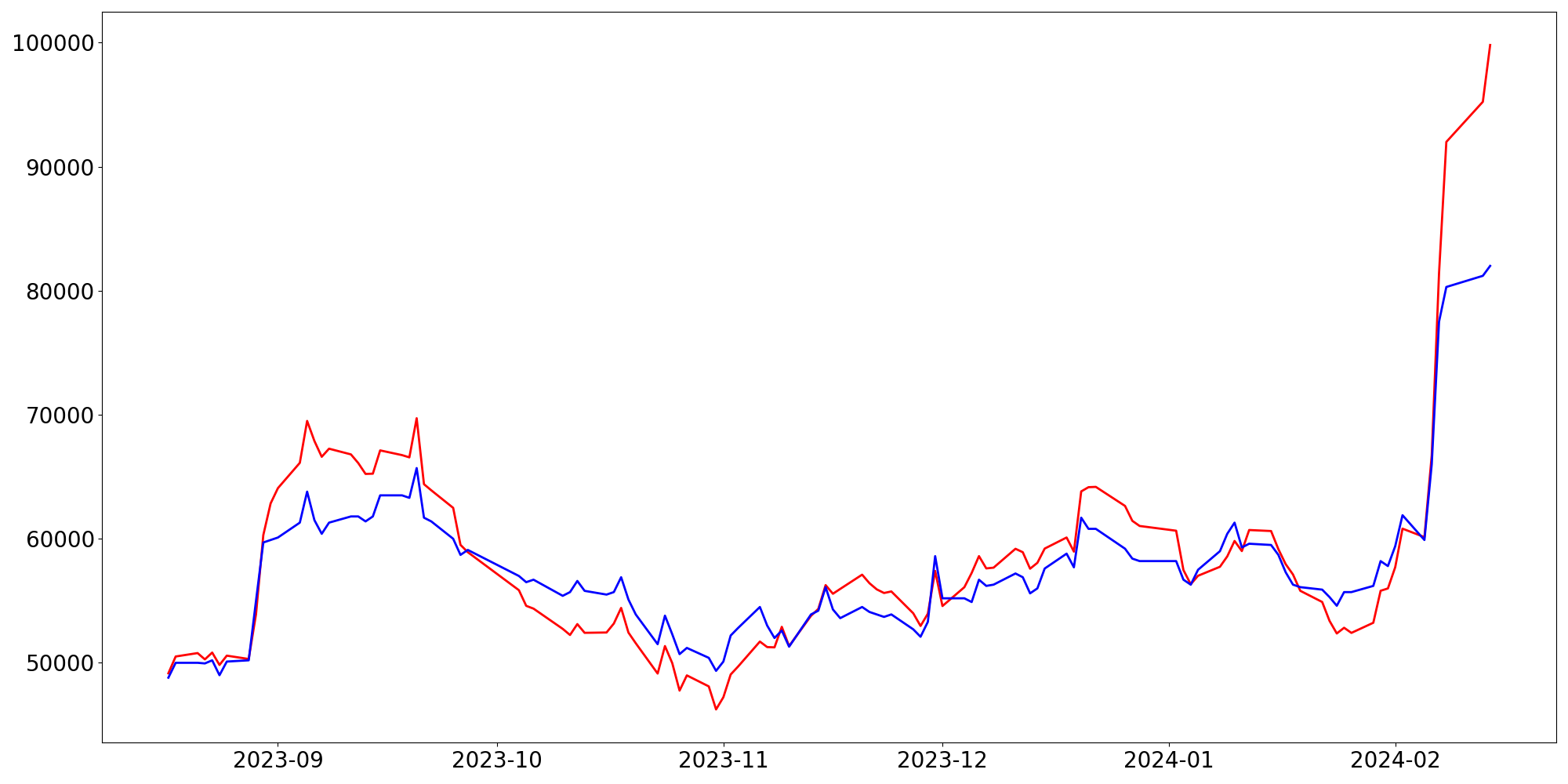 [ - : 실제값(종가) / - : 예측값(종가) ]