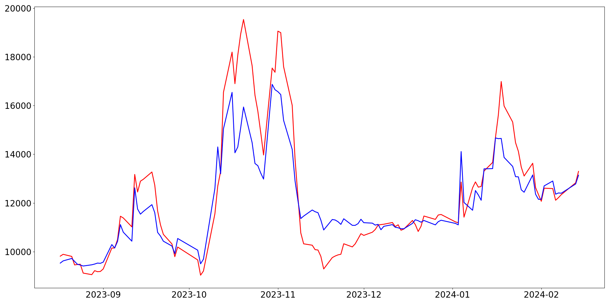 [ - : 실제값(종가) / - : 예측값(종가) ]