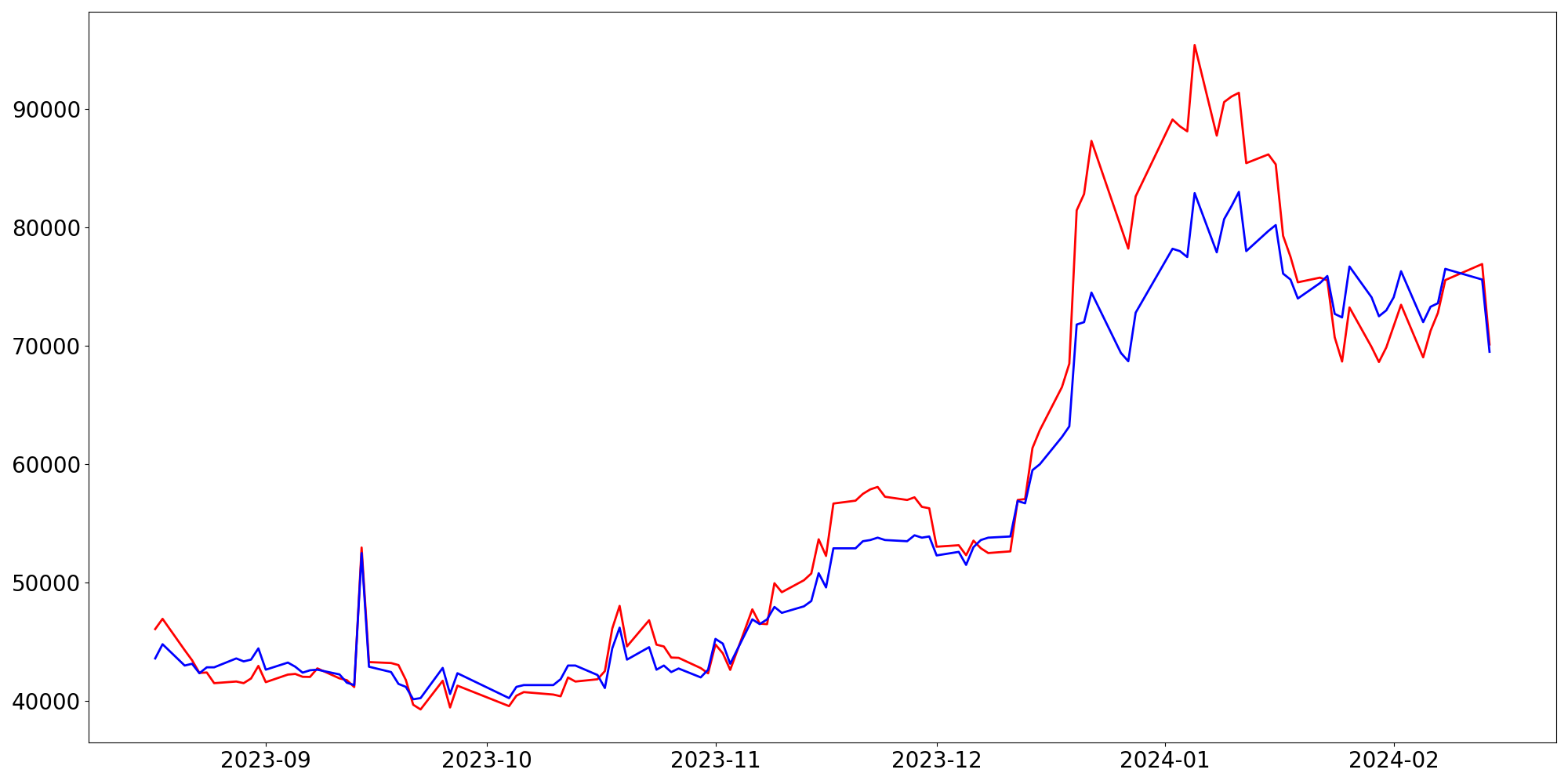 [ - : 실제값(종가) / - : 예측값(종가) ]