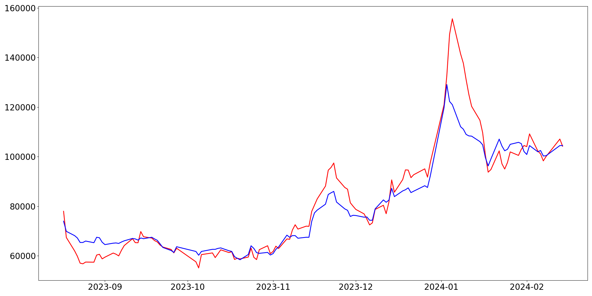 [ - : 실제값(종가) / - : 예측값(종가) ]