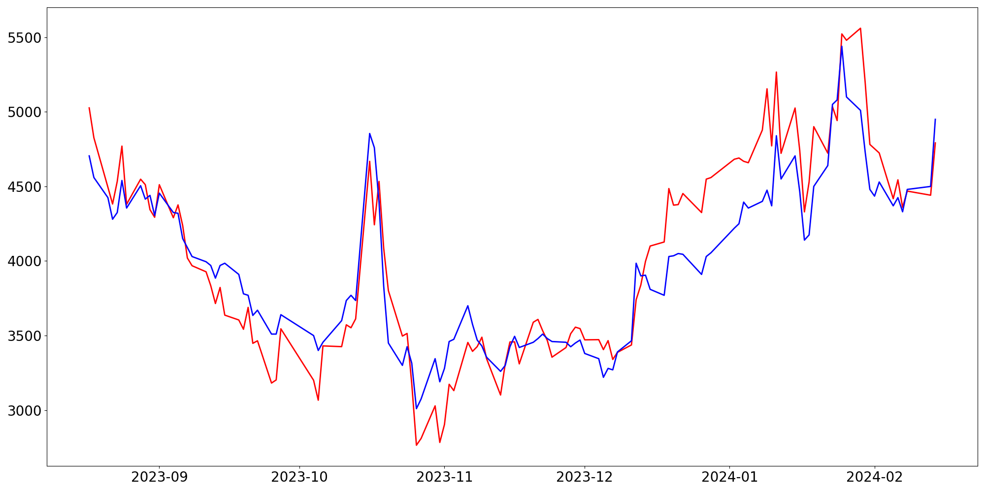 [ - : 실제값(종가) / - : 예측값(종가) ]