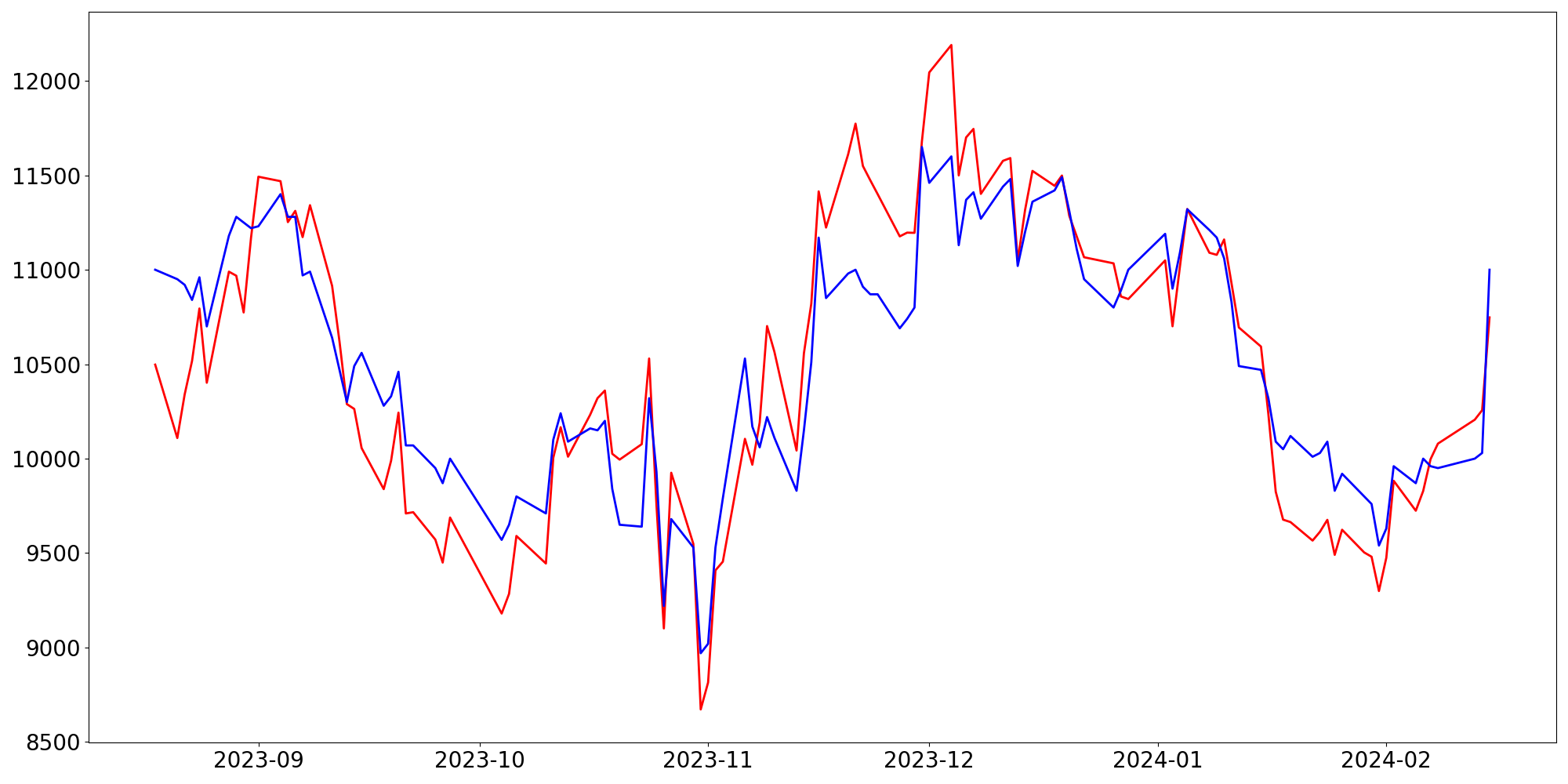 [ - : 실제값(종가) / - : 예측값(종가) ]
