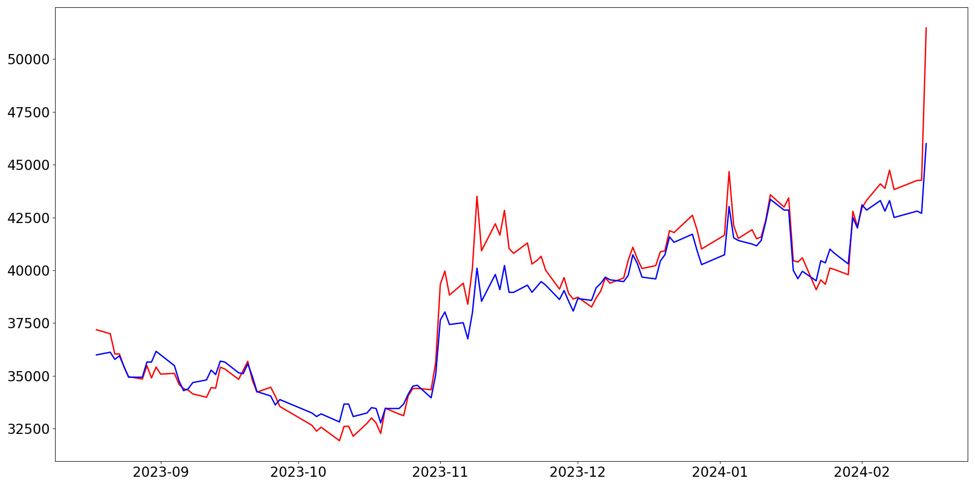 [ - : 실제값(종가) / - : 예측값(종가) ]