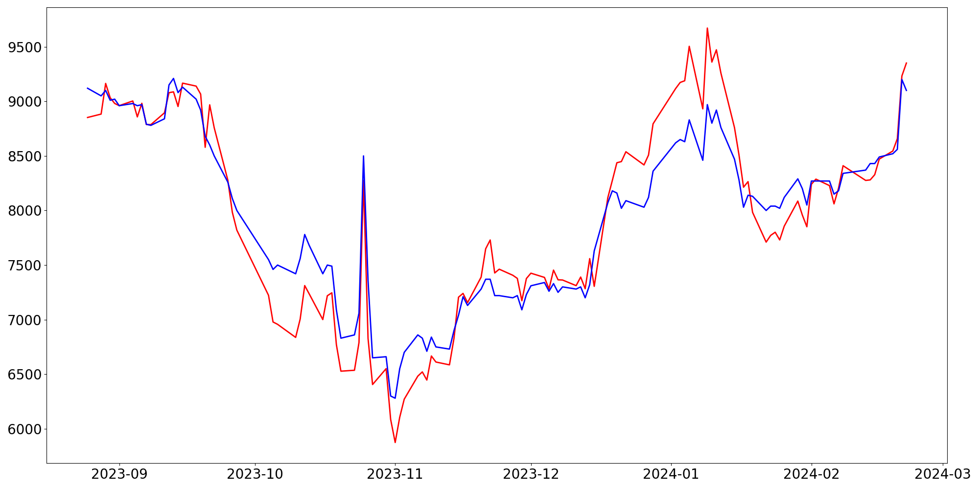 [ - : 실제값(종가) / - : 예측값(종가) ]