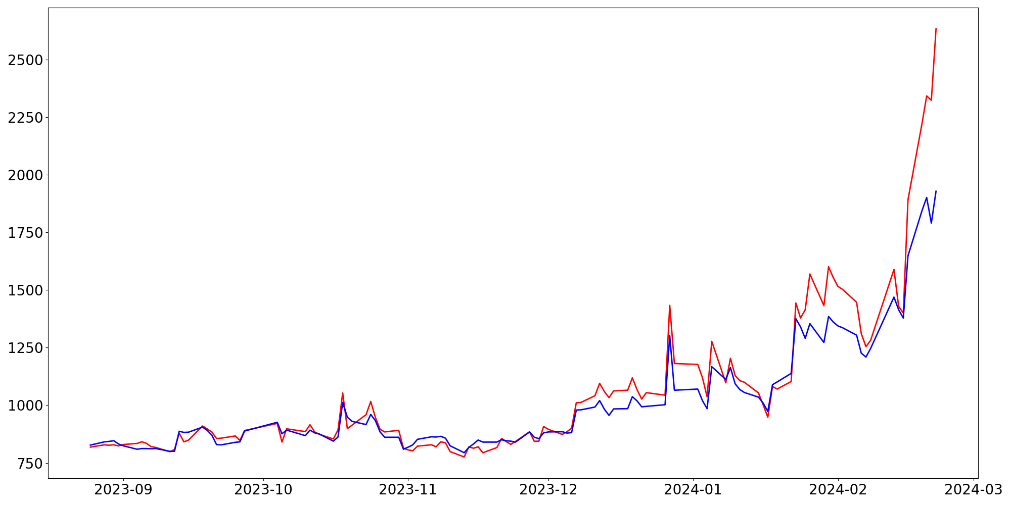 [ - : 실제값(종가) / - : 예측값(종가) ]