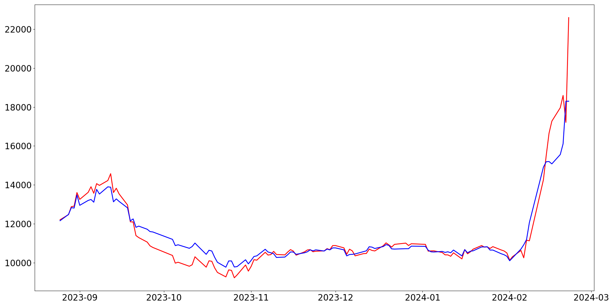 [ - : 실제값(종가) / - : 예측값(종가) ]
